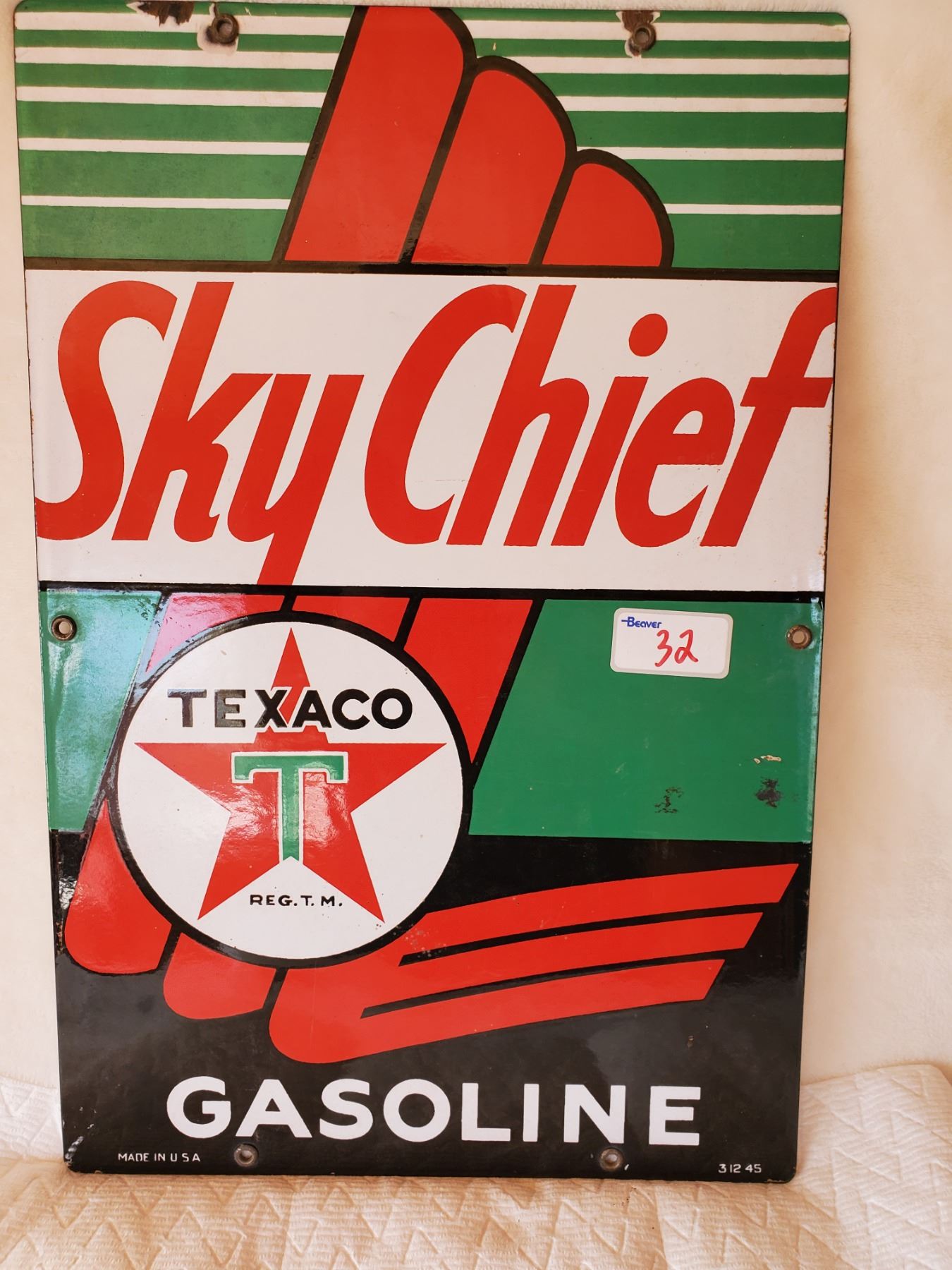 12" X 18" TEXACO SKY CHIEF PORCELAIN SIGN, DATED 1945 - EXCELLENT