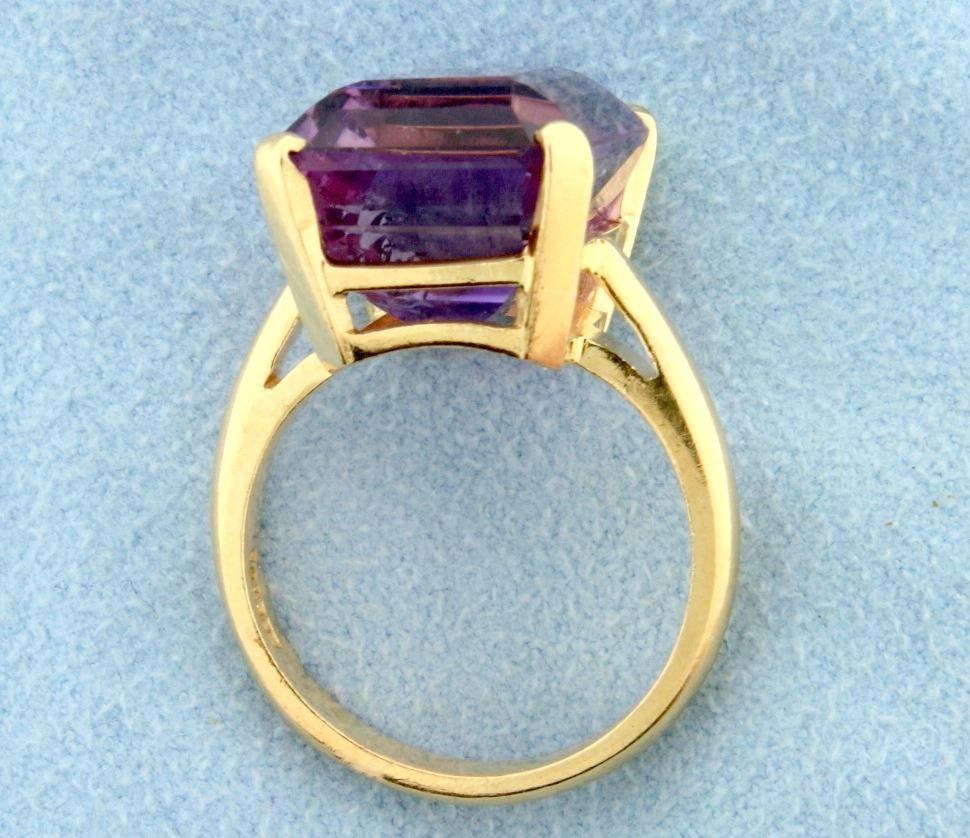 In 14k yellow gold. Size 6 3/4. Contains a large high quality natural amethyst gemstones measuring over 16 x 12mm with excellent color and bright purple color. 8.2g.