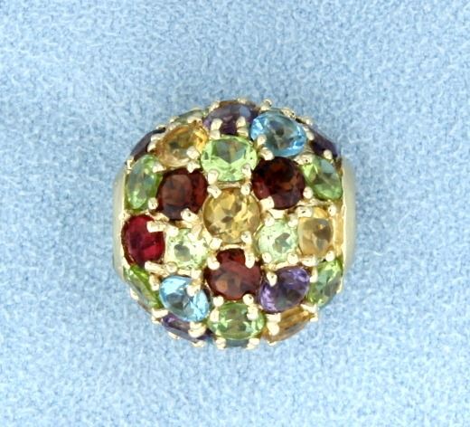 In 14k yellow gold, the slide is 3/4 inch long. It can accommodate up to a 6mm wide chain or omega. The slide contains 12 cts of Ruby, Citrine, Amethyst, Blue Topaz, Peridot, and Garnet Gemstones. 6.9g