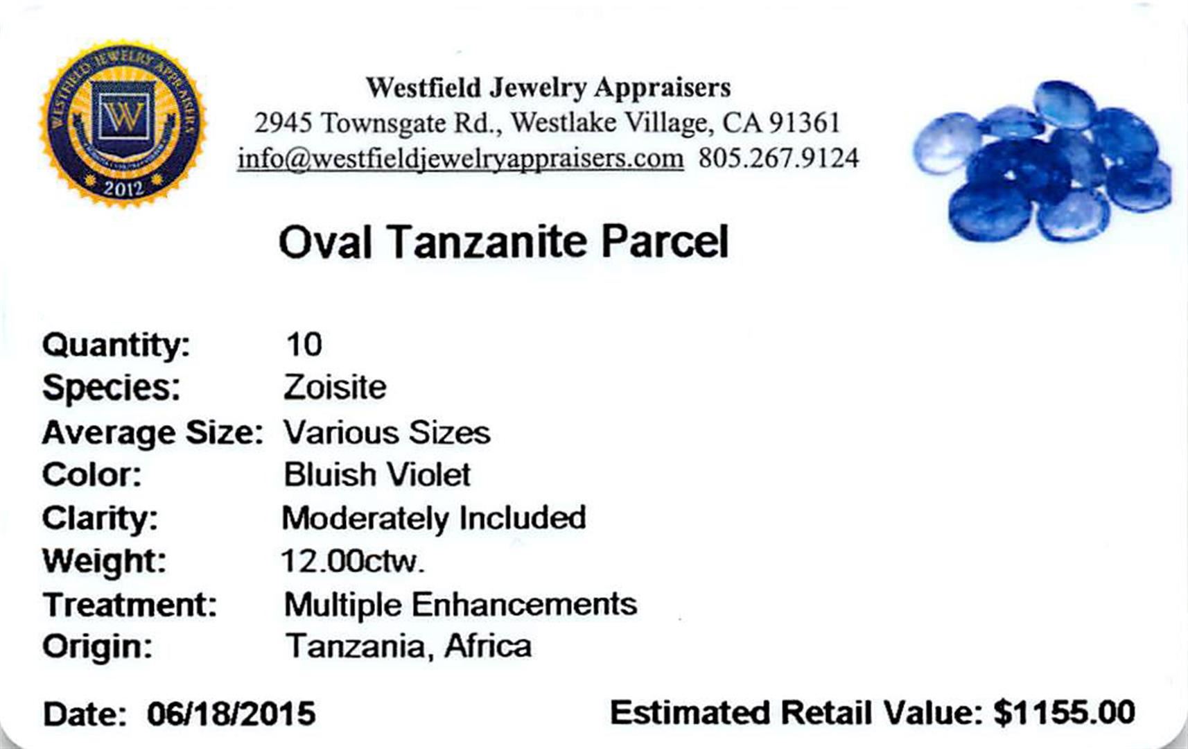 Ten oval mixed cut natural tanzanites exact total weight 12.00ct., clarity is moderately included, type I, medium dark, very slightly grayish, bluish violet color, (GIA bV 6/3), cut is good. Transmitting light with a minimum of distortion, transparent. Naturally occurring internal & external characteristics are present. Color grade is an average for the group. Tanzanite is a very rare gemstone that is only found in the country of Tanzania. Originally discovered in 1967. Tiffany & Company, named the stone Tanzanite. It is found in the Usumburu Mountains that border the Umba Valley of northern Tanzania. Tanzanite occurs in gray, brown, violet, blue, reddish-purple, & green. The gem is interesting because of its exceptional pleochroism. Rotated in different directions a tanzanite will exhibit multiple changes of color. Tanzanite has a low tolerance to ultrasonic cleaning, and should not be cleaned using this method. Westfield Appraised at $1,155.00.