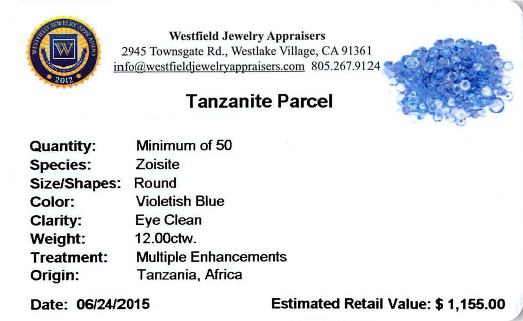 Fifty round mixed cut natural tanzanites, measuring 3.50 - 3.50 x 2.27 mm, exact total weight 12.00ct., clarity is slightly included, type I, medium dark, very slightly grayish, violetish blue color, (GIA vB 6/3), cut is good. Measurements & the color grade are an average for the group, Color grade is an average for the group, Transmitting light with no distortion, transparent, Naturally occurring internal & external characteristics are present, Indications of multiple laboratory enhancements, including high temperature heat treatment. Westfield Appraised at $1,155.00.