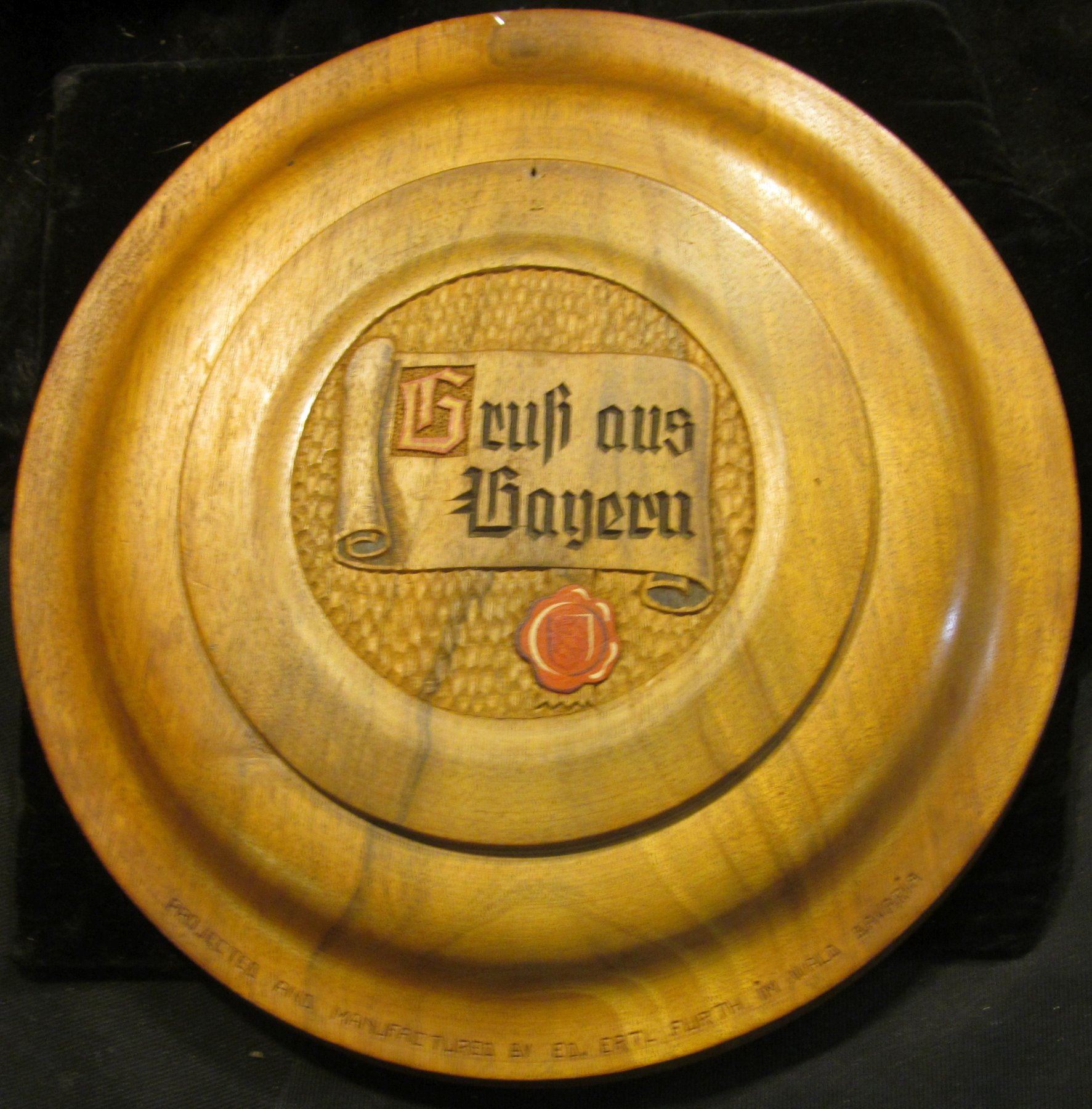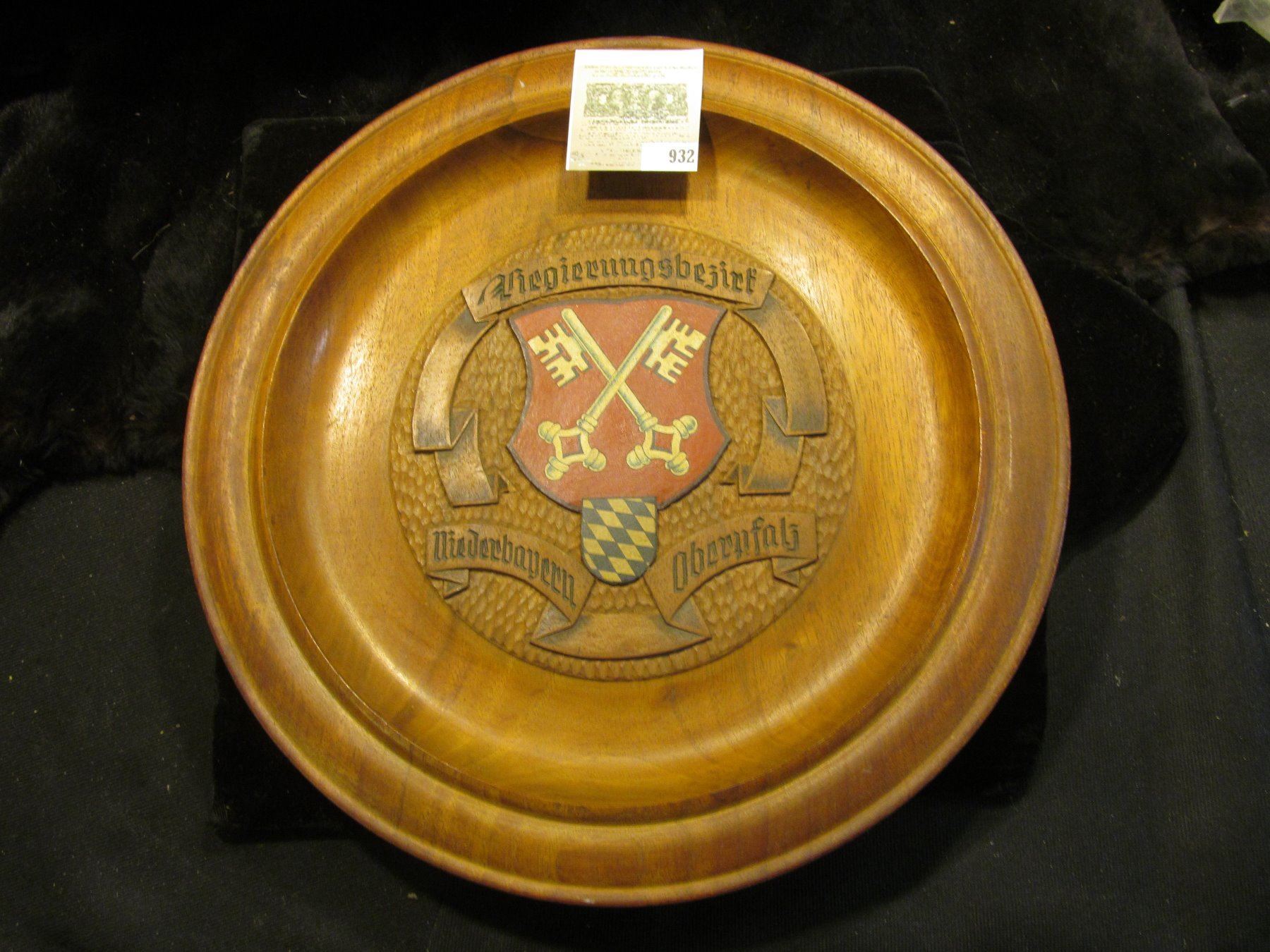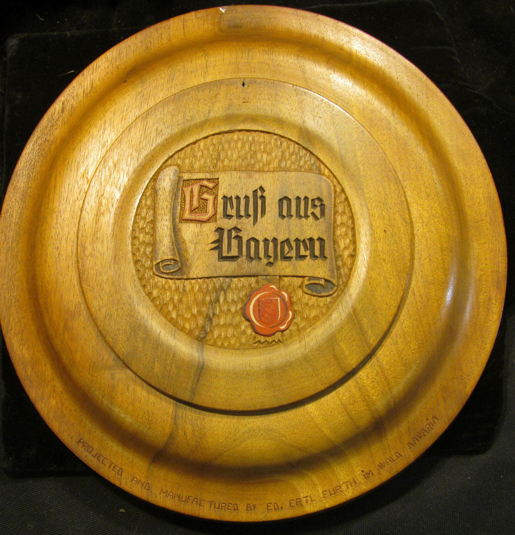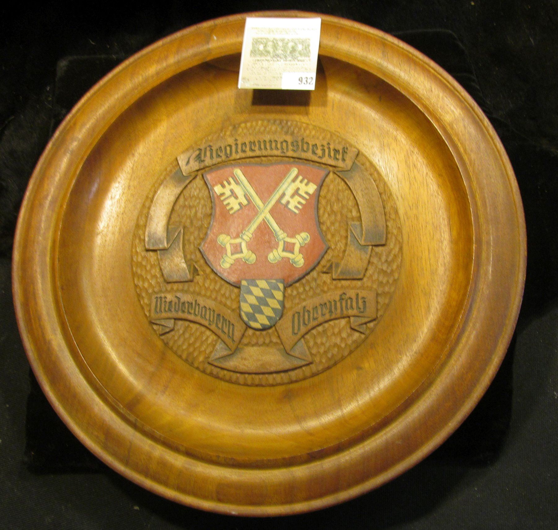 12" diameter "Regiernngbezirf Neiderbayern Obcryfal" engraved Wooden Plate with Coat-of-Arms exhibiting a pair of keys, reverse engraved "Gruh aus Bayern", "Projected and Manufactured by Ed. Ertl Furth Im Wald Bavaria".