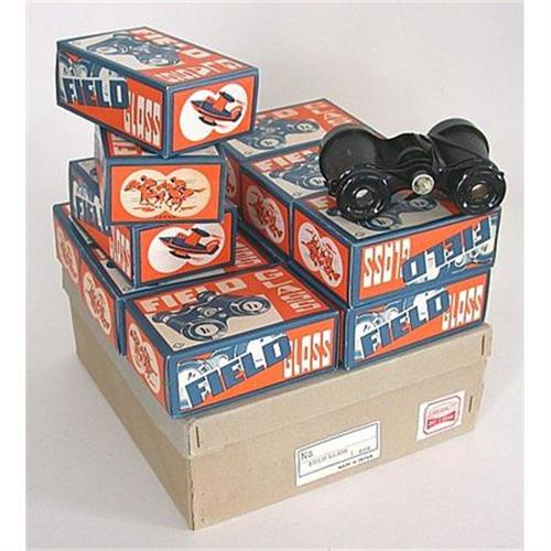 TOY BINOCULARS, in original illustrated box, these vintage field glasses are 3-1/2? wide and have a tiny compass built into the nose bridge, made in Japan, 1950s. Priced individually at $9 each or full factory carton of 12 as shown for $96.