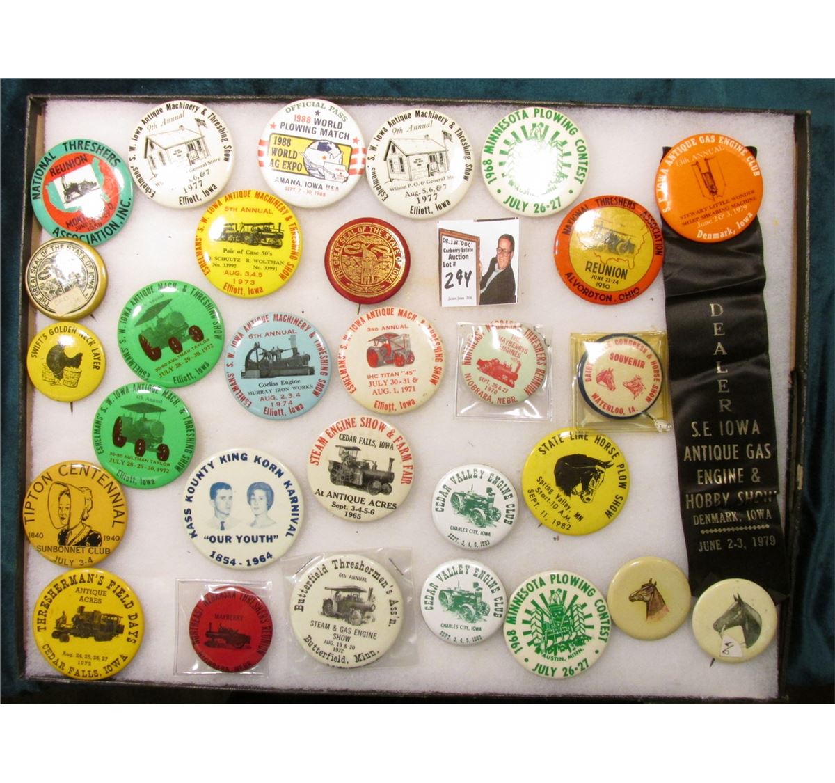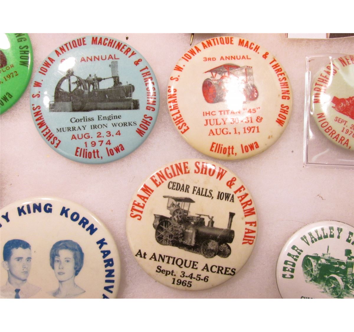 12" x 16" Glass frame full of Souvenir Pin-backs dating back to 1959 or earlier. Cedar Valley Engine Club; Elliot, Iowa; Northeast Nebraska Threshers Reunion; State Line Horse Plow Show, and more.