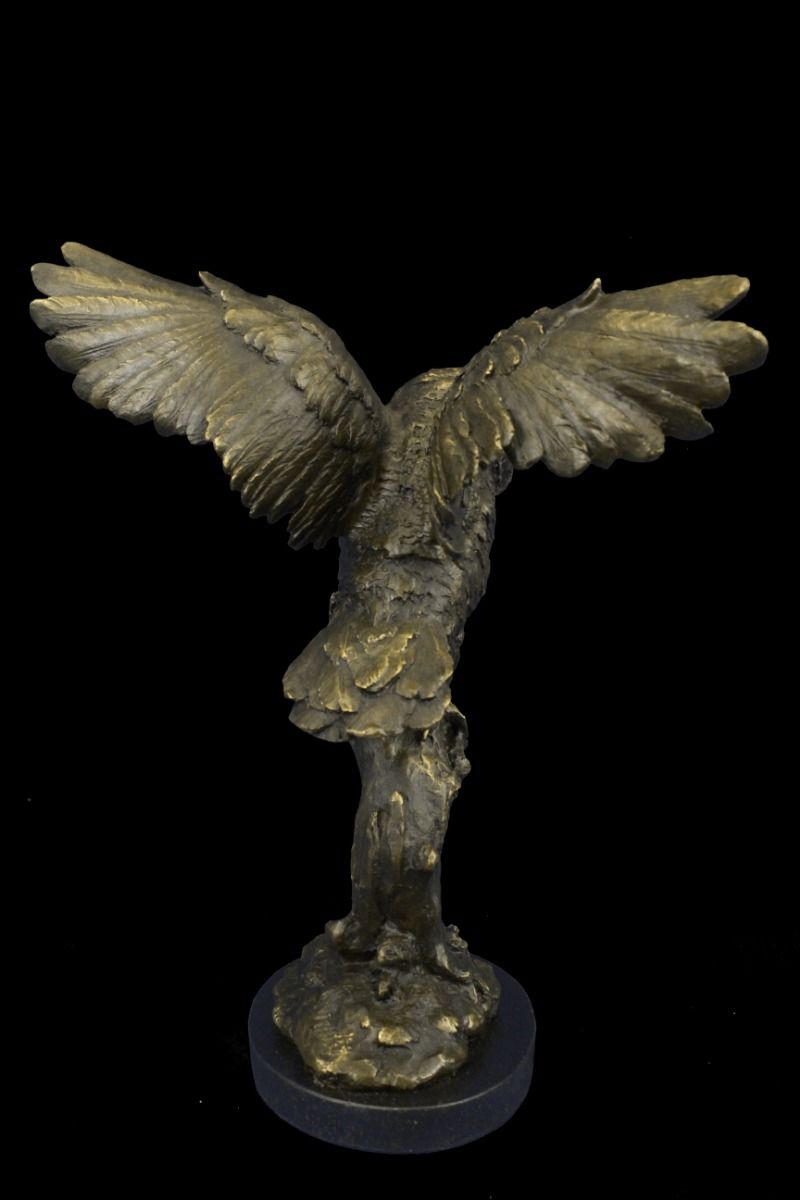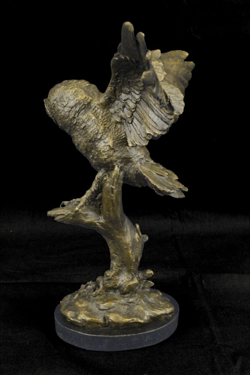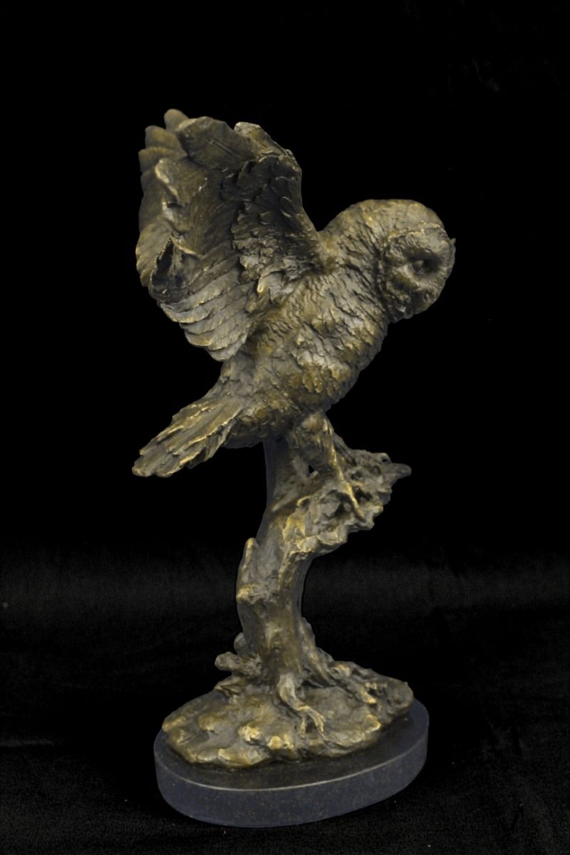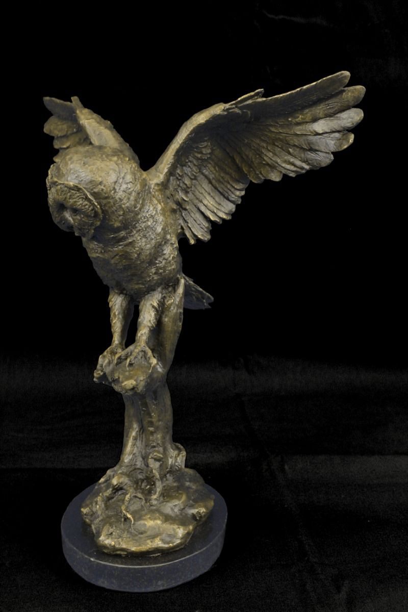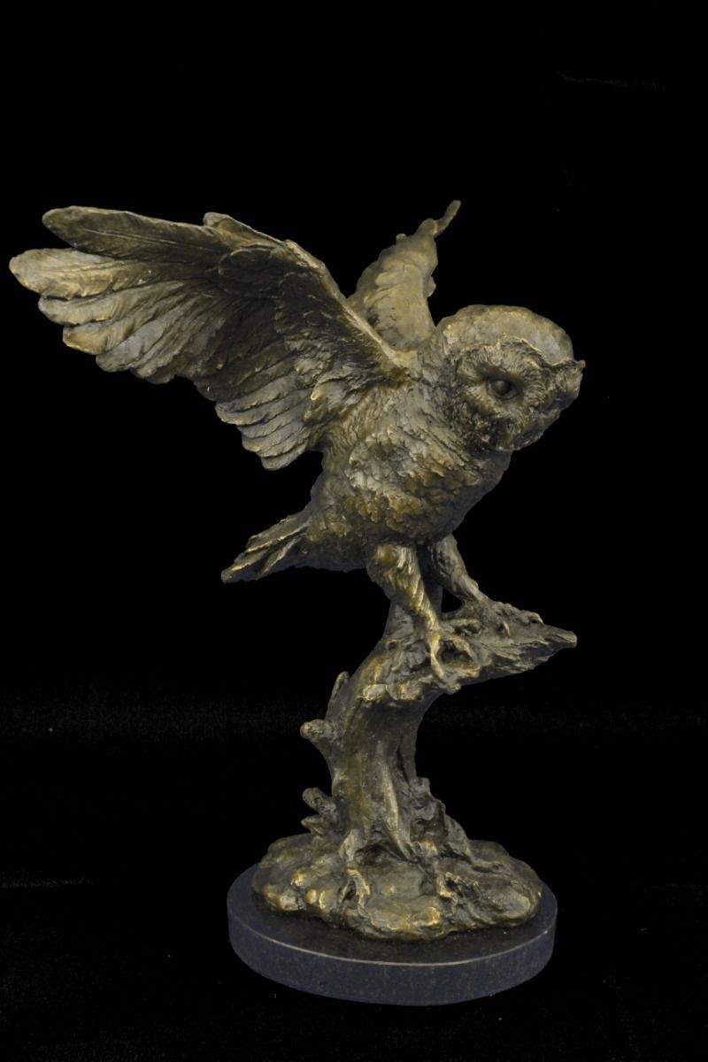 11YRD09580 This Sculpture Of This Medium Size Owl Is Scary But Amazingly Stunning With Its Owl Wings Spread Fully As Is He Just Landed On This Broken Tree Trunk. The Owl Has Large Downward-Facing Eyes, A Hawk-Like Beak And A Flat Face; And His Conspicuous Circle Of Feathers Are Beautiful.. Most Birds Of Prey Sport Eyes On The Sides Of Their Heads, But The Stereoscopic Nature Of The Owl'S Forward-Facing Eyes Permits The Greater Sense Of Depth Perception Necessary For Low-Light Hunting. Although Owls Have Binocular Vision. Their Large Eyes Are Fixed In Their Sockets — As Are Those Of Other Birds — So They Must Turn Their Entire Head To Change Views. Owls Can Rotate Their Heads And Necks As Much As 270 Degrees In Either Direction. As Owls Are Farsighted, They Are Unable To See Clearly Anything Within A Few Centimeters Of Their Eyes. Caught Prey Can Be Felt By Owls With The Use Of Filo-Plumes — Small Hair-Like Feathers On The Beak And Feet That Act As "Feelers". Their Far Vision, Particularly In Low Light, Is Exceptionally Good. The Owl Was Cast Using The Archaic Method Of Lost-Wax Casting And Stained With A Brown Patina Finish For Perpetuation. The Bronze Sculpture Was Rests Upon A Black Marble Base...................SHIPPING USA: $20....HI, ALASKA, CANADA: $40...ALL OTHER COUNTRIES: $79