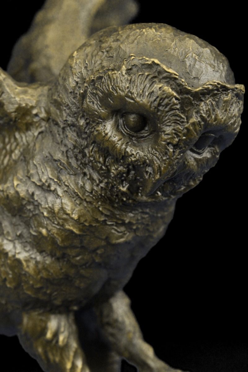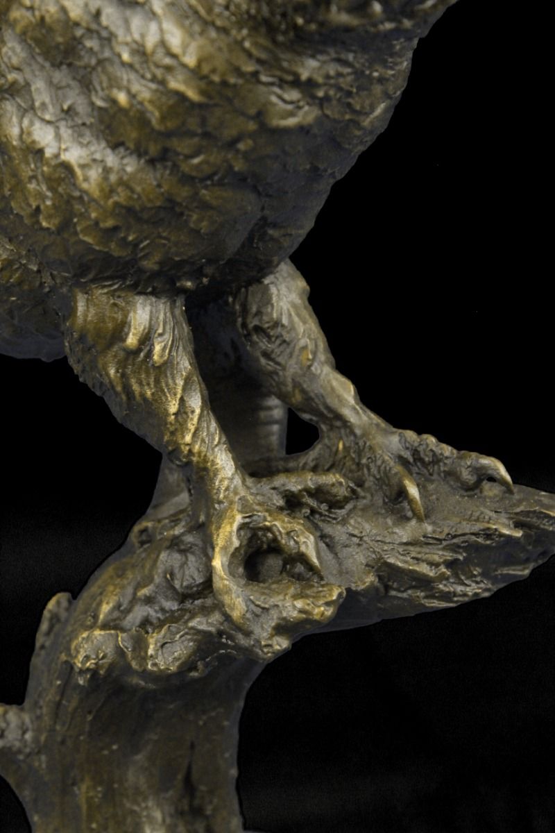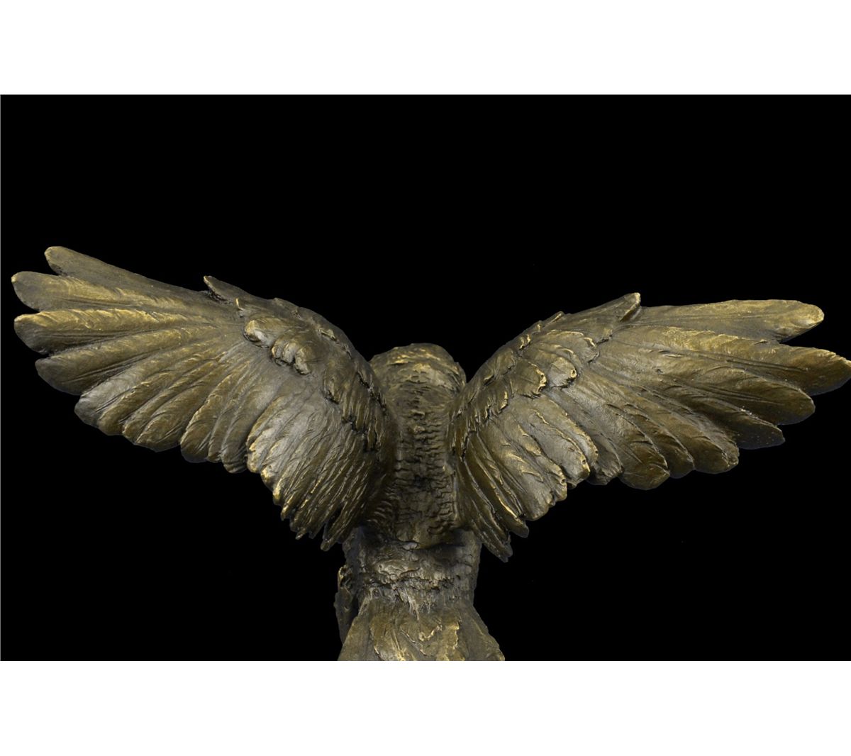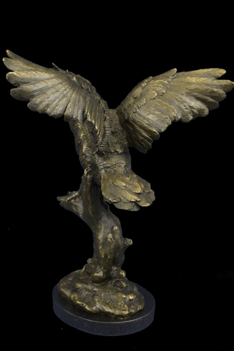 11YRD09580 This Sculpture Of This Medium Size Owl Is Scary But Amazingly Stunning With Its Owl Wings Spread Fully As Is He Just Landed On This Broken Tree Trunk. The Owl Has Large Downward-Facing Eyes, A Hawk-Like Beak And A Flat Face; And His Conspicuous Circle Of Feathers Are Beautiful.. Most Birds Of Prey Sport Eyes On The Sides Of Their Heads, But The Stereoscopic Nature Of The Owl'S Forward-Facing Eyes Permits The Greater Sense Of Depth Perception Necessary For Low-Light Hunting. Although Owls Have Binocular Vision. Their Large Eyes Are Fixed In Their Sockets — As Are Those Of Other Birds — So They Must Turn Their Entire Head To Change Views. Owls Can Rotate Their Heads And Necks As Much As 270 Degrees In Either Direction. As Owls Are Farsighted, They Are Unable To See Clearly Anything Within A Few Centimeters Of Their Eyes. Caught Prey Can Be Felt By Owls With The Use Of Filo-Plumes — Small Hair-Like Feathers On The Beak And Feet That Act As "Feelers". Their Far Vision, Particularly In Low Light, Is Exceptionally Good. The Owl Was Cast Using The Archaic Method Of Lost-Wax Casting And Stained With A Brown Patina Finish For Perpetuation. The Bronze Sculpture Was Rests Upon A Black Marble Base...................SHIPPING USA: $20....HI, ALASKA, CANADA: $40...ALL OTHER COUNTRIES: $79