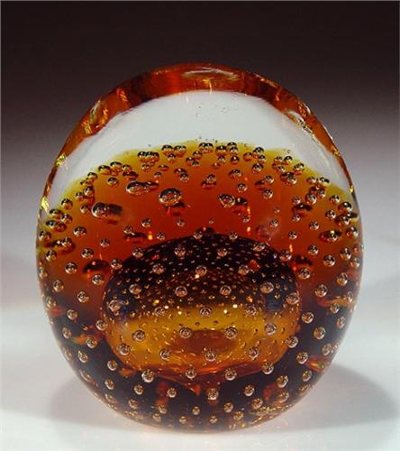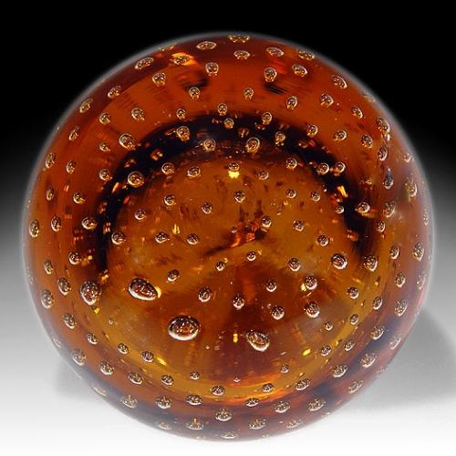 Miscellaneous amber bubble paperweight, with a clear-encased translucent amber cushion, which is covered with tiny spaced bubbles, and has a large round bubble at its center. Diameter 3". NO RESERVE