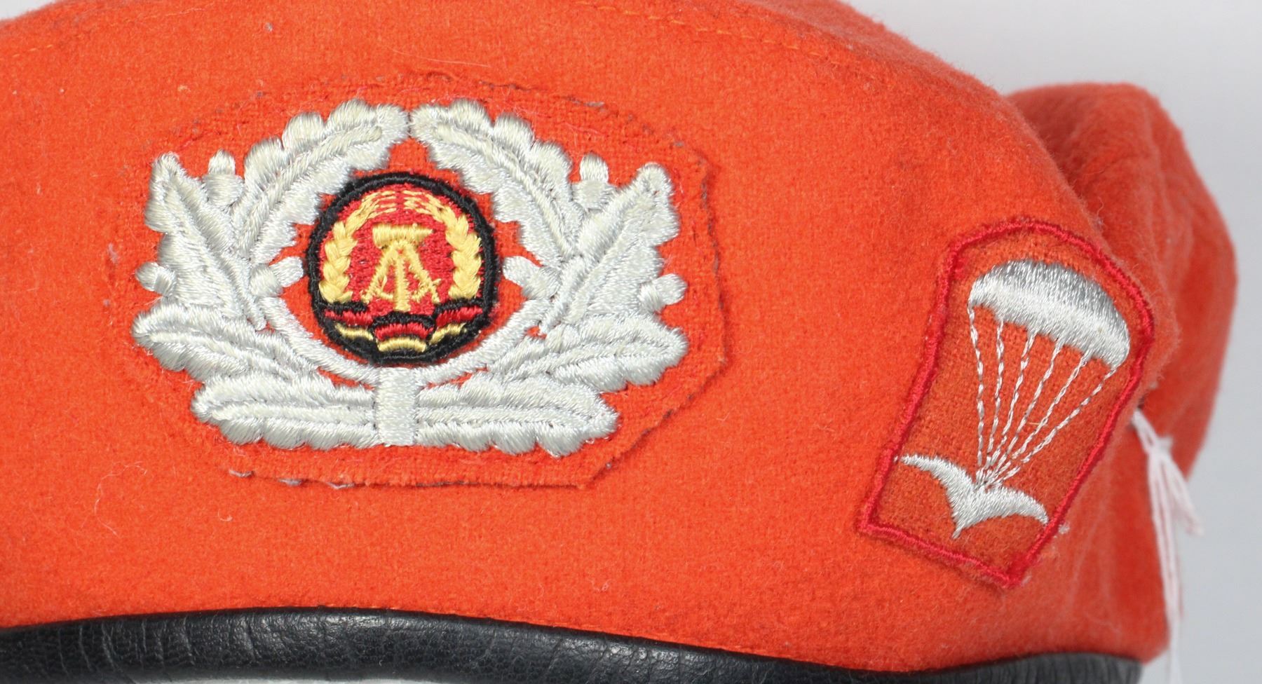 FALLSCHIRMJÄGER FALLSCHIRMJAGER WITH INSIGNIA PARATROOPER AIRBORNECOLD WAR ERA ST MILITARY GDR DDR EAST GERMAN DEMOCRATIC REPUBLIC GERMANY COMMUNIST SOCIALIST DDR USSR CCCP SOVIET UNION MILITARY HEADGEAR 1900'S 20TH CENTURY DEUTSCHLAND