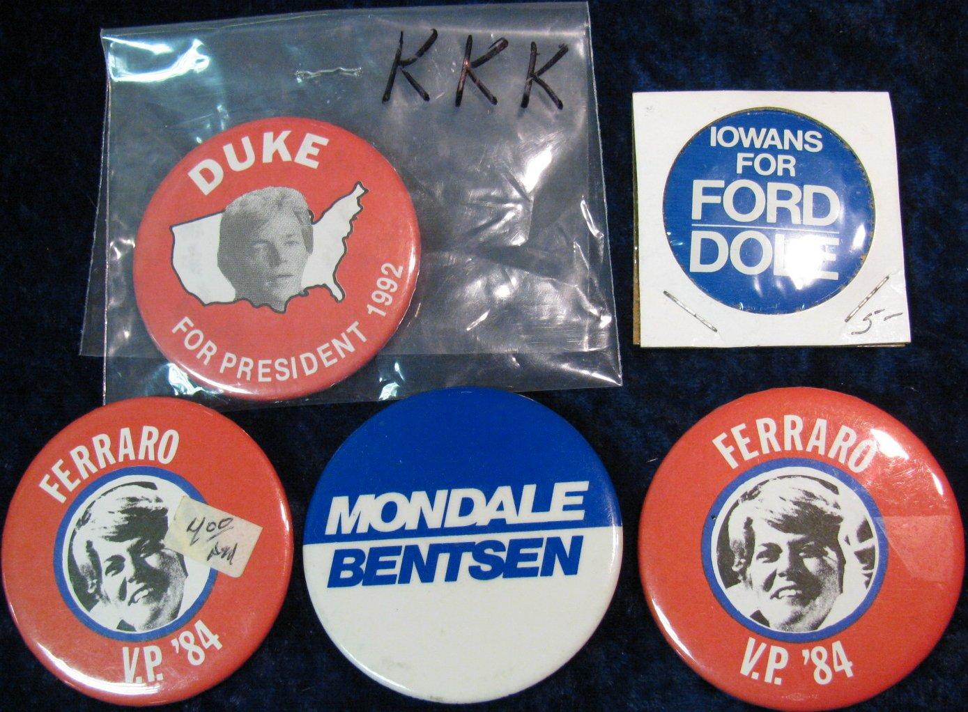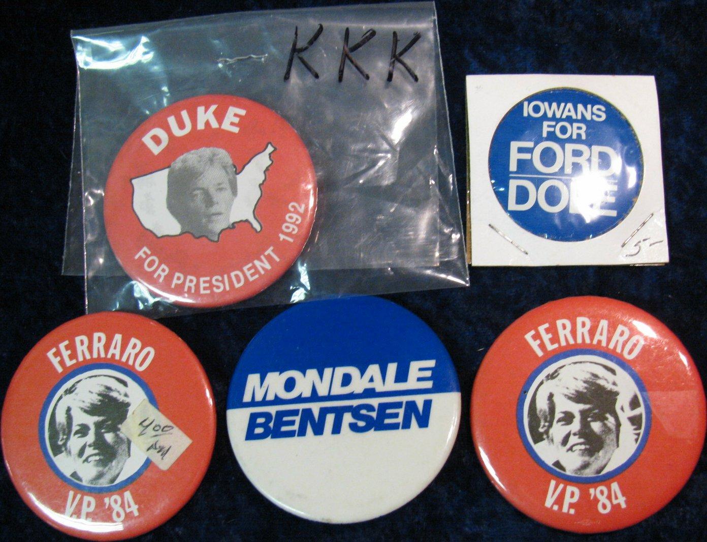 1201. (5) Campaign Buttons, Ford-Dale, Mondale-Bentsen, 1992 Duke & 1984 Ferraro.