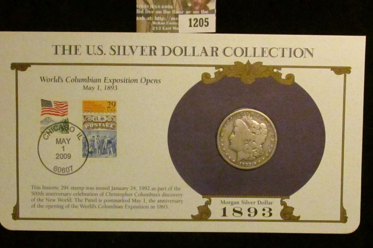 1893 New Orleans Mint Morgan Silver Dollar in a special protected cover with post marked commemorative cover and stamps. Definitely a scarce coin.