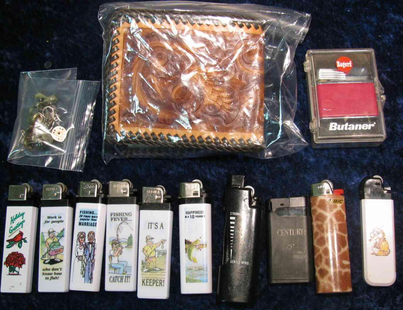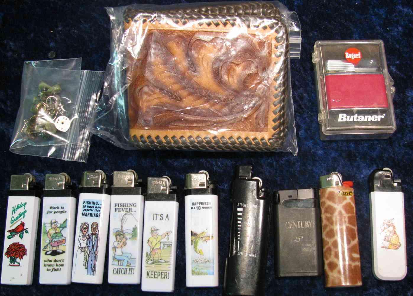 1206. (11) Lighters, Hand Tooled Leather Wallet & Several Pairs of Earrings.