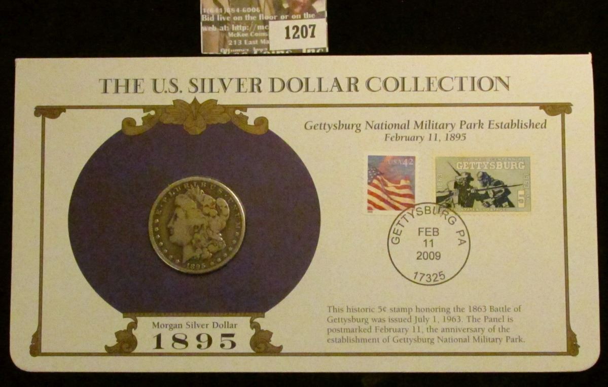 1895 New Orleans Mint Morgan Silver Dollar in a special protected cover with post marked commemorative cover and stamps. Definitely a scarce coin.