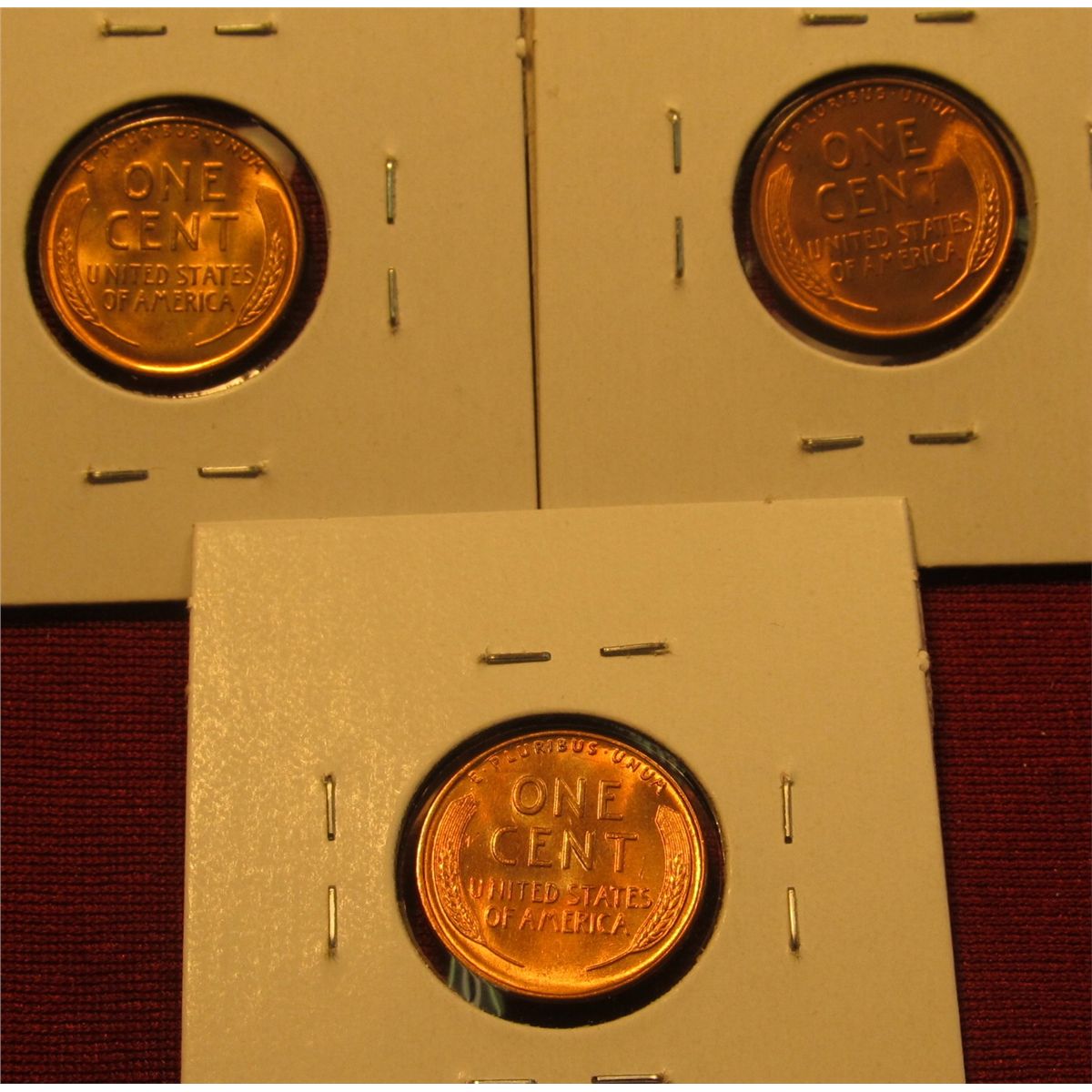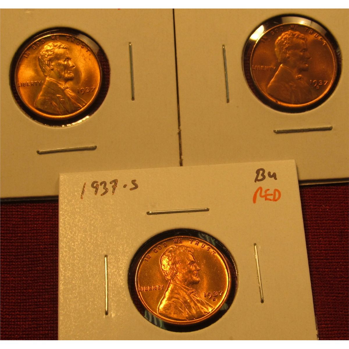1209. 3 Lincoln Cents – 1937 PDS, all BU RED, part of set break