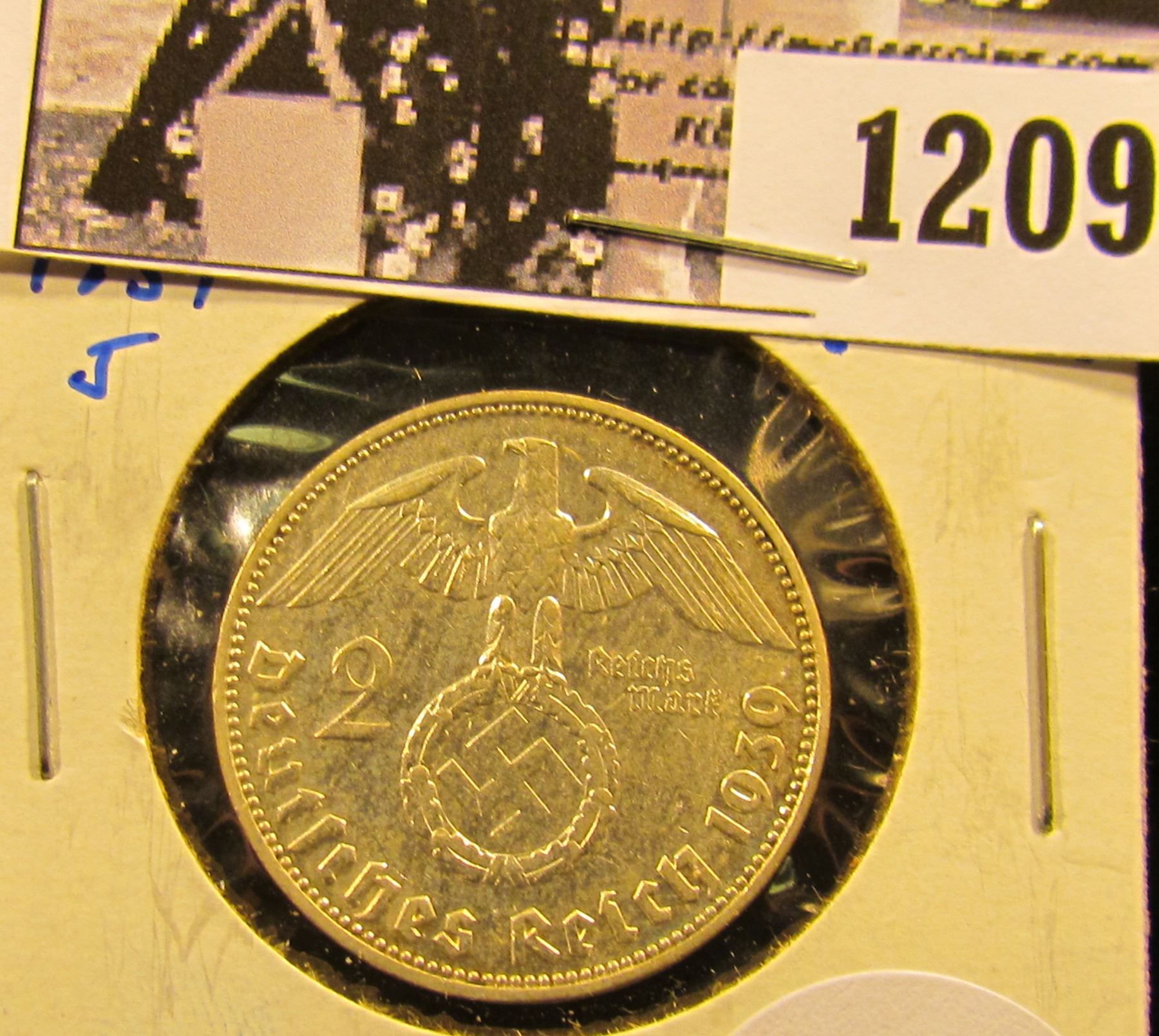 1209 . Beautiful High Grade Silver 2 Mark Coin From Germany. Von Hindenburg Is On The Front And The Eagle & Swastika Are On The Reverse