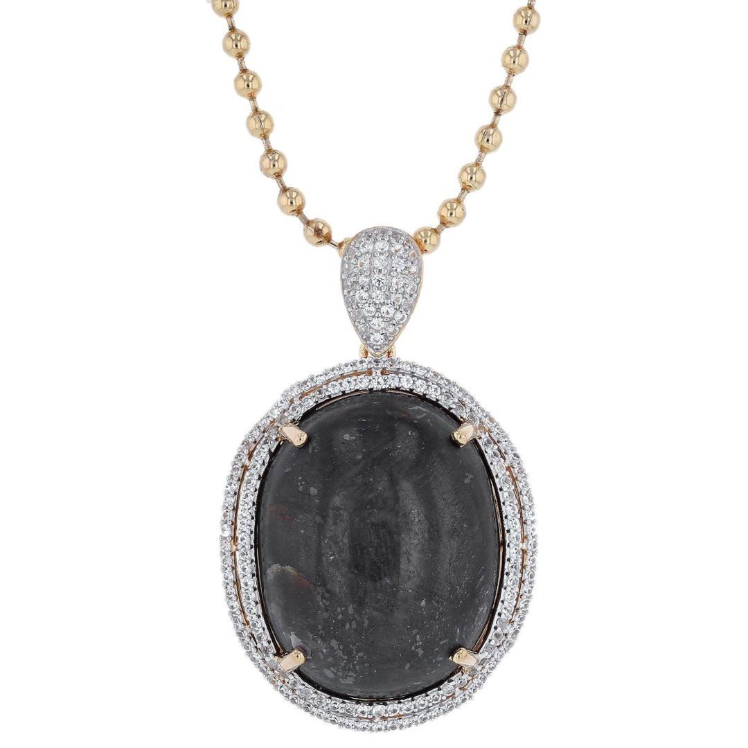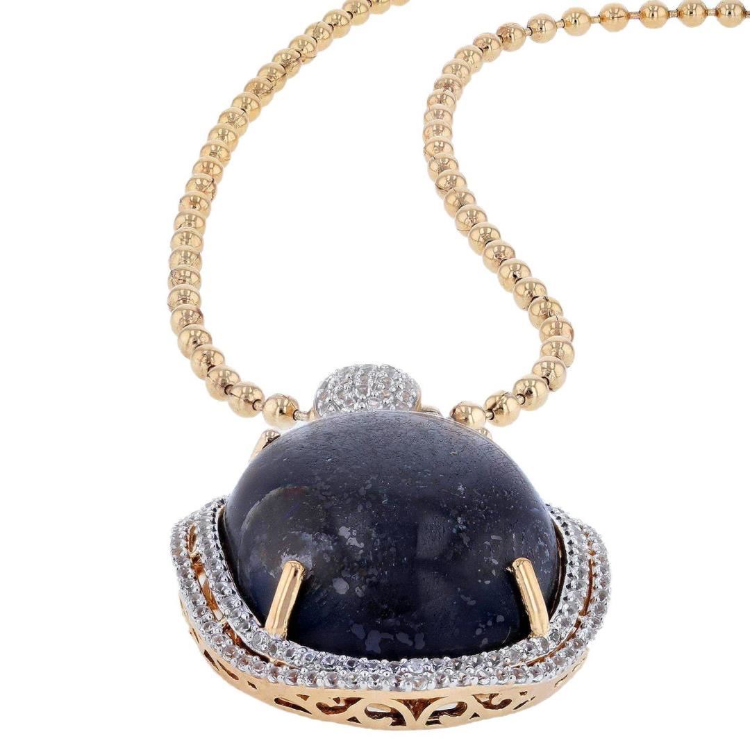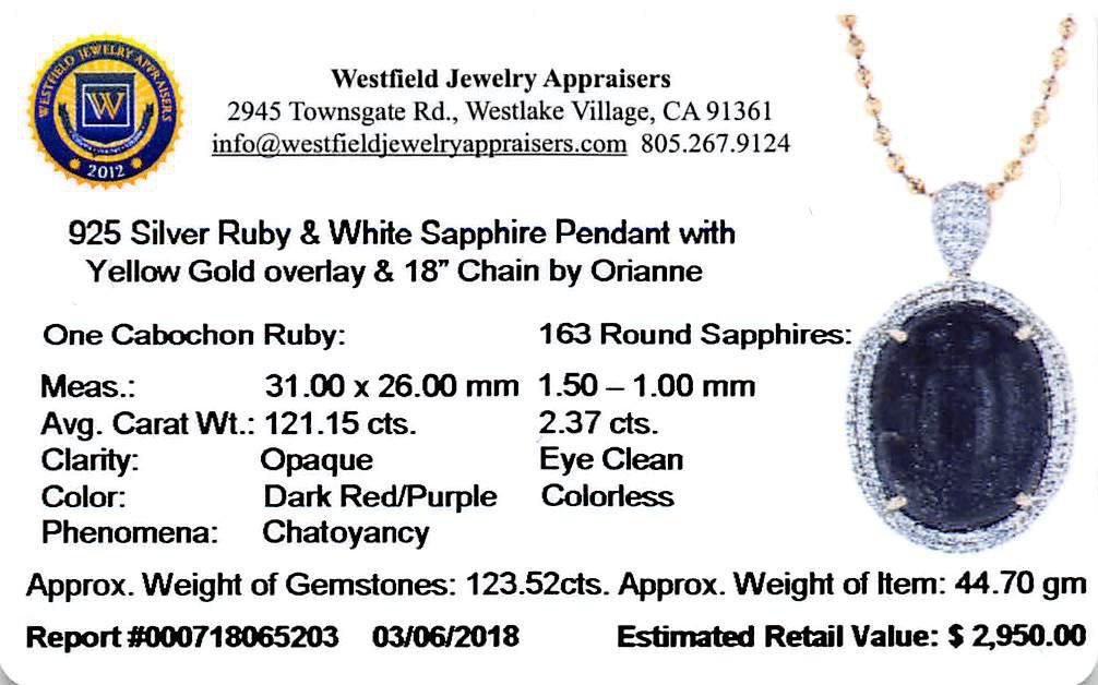 One electronically tested 925 silver with gold overlay, ladies cast & assembled ruby and sapphire pendant with chain. 18†length. Trademark is Orianne. Identified with markings of "925". Condition is new, good workmanship. Containing: One prong set oval cabochon cut natural ruby with chatoyancy phenomena, measuring 31.00 x 26.00 x 16.90mm, approximate weight of 121.15ct., type II, dark, brownish, strongly purplish red color, (GIA stpR 7/1), cut is good. One hundred sixty-three prong set round mixed cut natural white sapphires, measuring 1.50 - 1.00 x 0.81 mm, approximate total weight of 2.37ct., clarity is eye clean, colorless, very slightly grayish, white color, (GIA W 0/3), cut is good. Total Weight of Colored Stones 123.52 ct. Total Weight of Pendant With Chain 44.70 gm