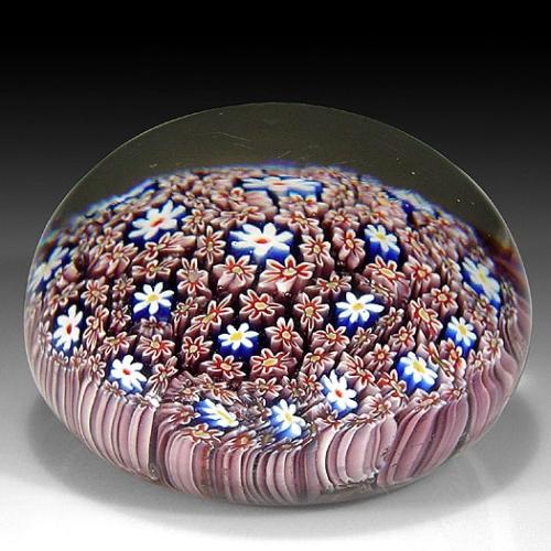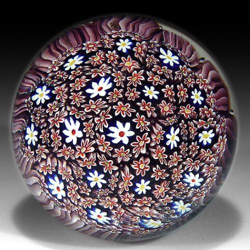 Murano Italian millefiori carpet of flowers paperweight, with a close arrangement of complex canes, each composed of a central white flower, which is encircled by a ring of red flowers, on black ground. Diameter 2 5/8". NO RESERVE