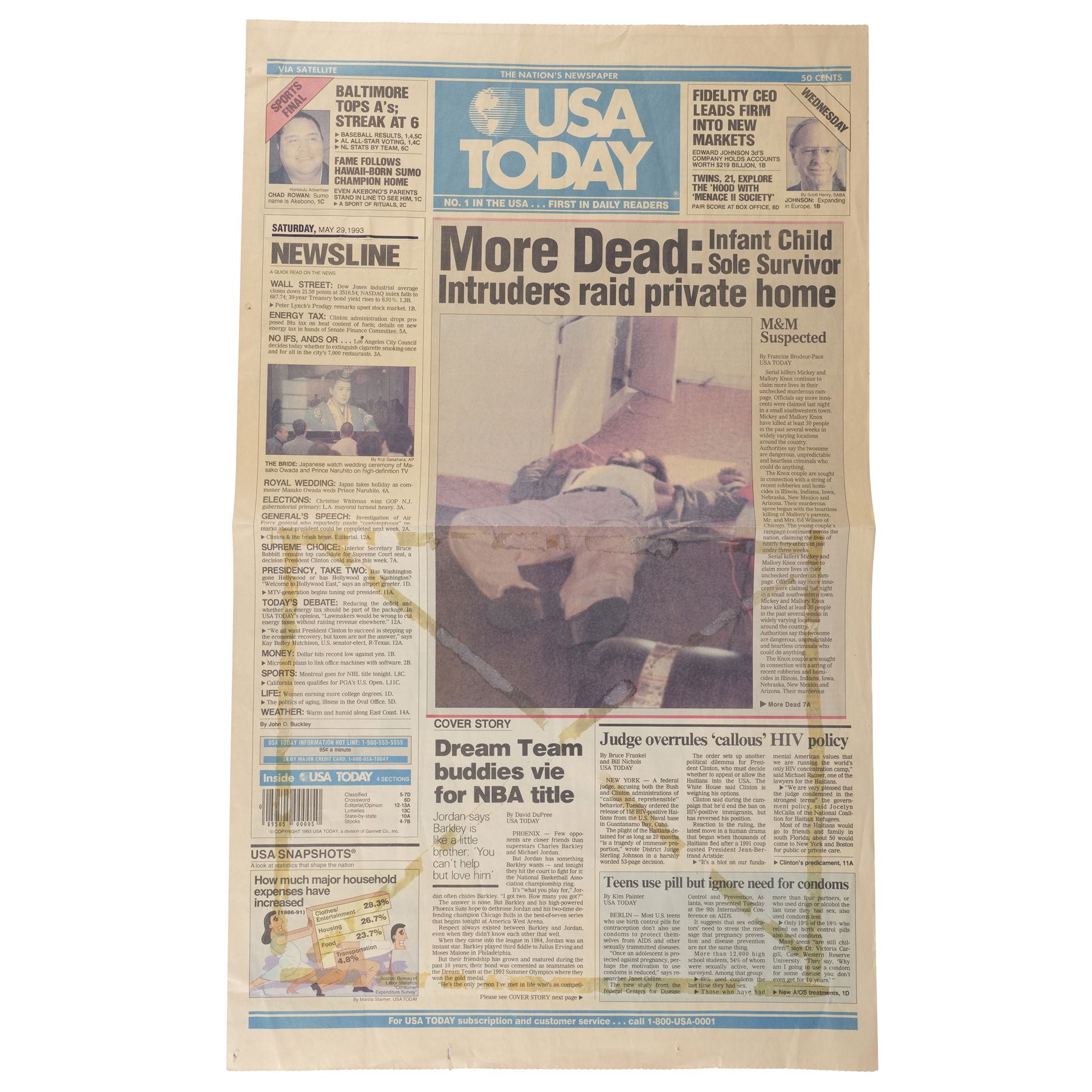 This lot consists of six newspapers created by production. Newspaper publications included are a Chicago Courier highlighting the murder of Malory's parents; a Oklahoma City Inquirer showing officers uncovering the Knoxs' latest murder; a Miami Telegraph of a survivor sharing their story against the Knoxs; an Albuquerque Journal highlighting the Knox's attacking a food convenience store; a USA Today covering a Knox attack resulting in an infant survivor; and a USA Today discussing the Knoxs' rising death toll. This lot exhibits discoloration and folded edges throughout. Dimensions: (largest) 14" x 11.75" x 0.25" (35.75 cm x 30 cm x 0.75 cm)