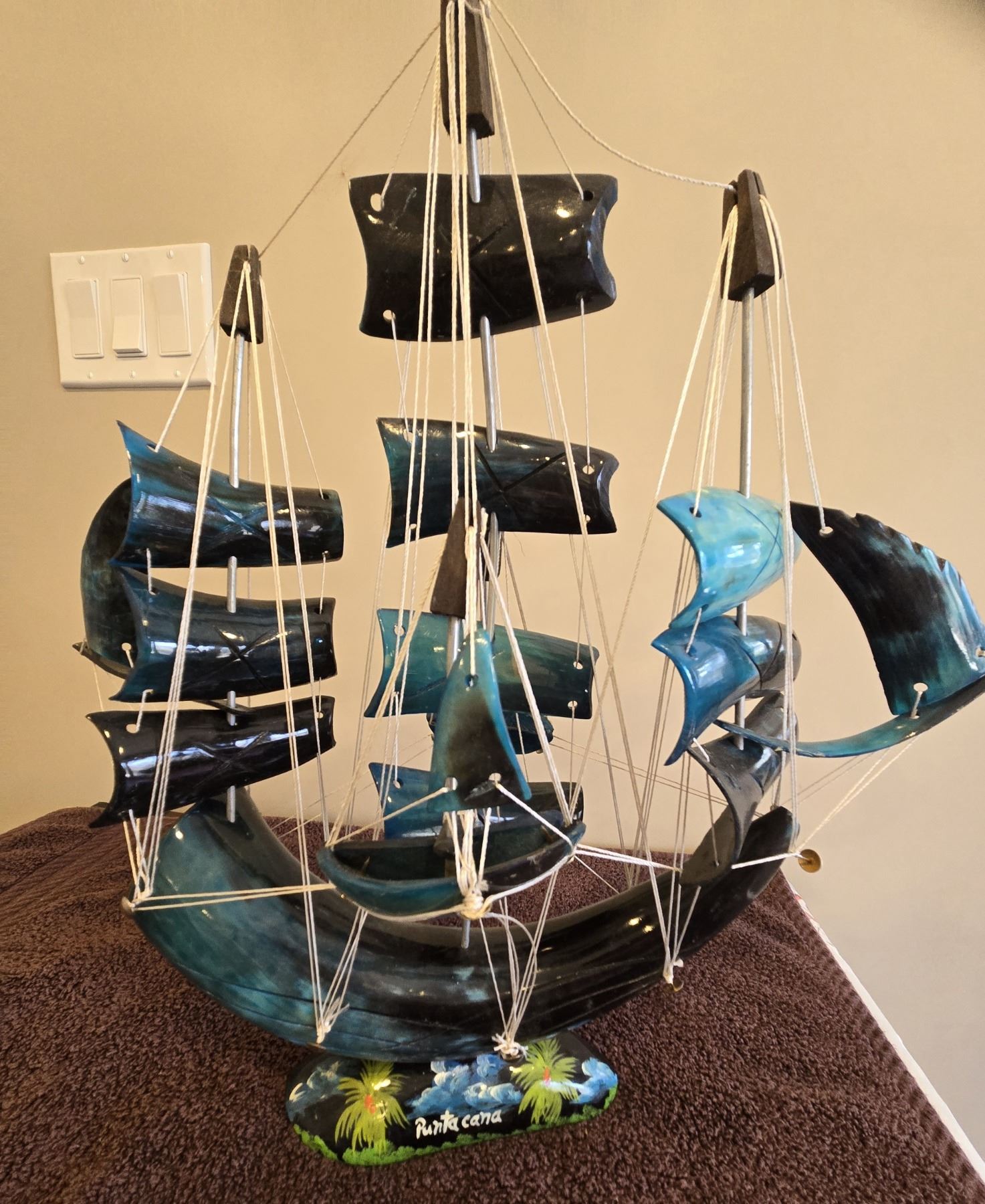 1214 - Decorative handmade shell sailboat, dark teal, blues and blacks with string, shells and horn. 16"x16" Stamped Punta Cana