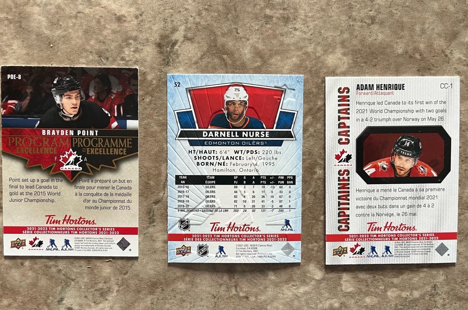 1214 –Tim Hortons 2021 22 Hockey. Mixed lot of 22 cards with Base, Captains and Program of Excellence.