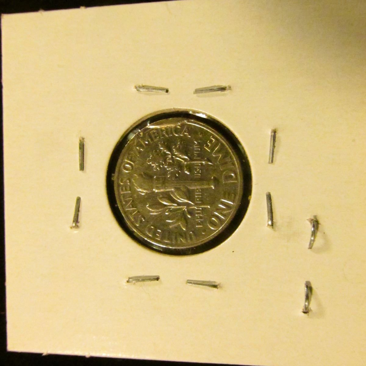 1216 . ERROR – 1969-D Roosevelt dime, die cud reverse, value $15