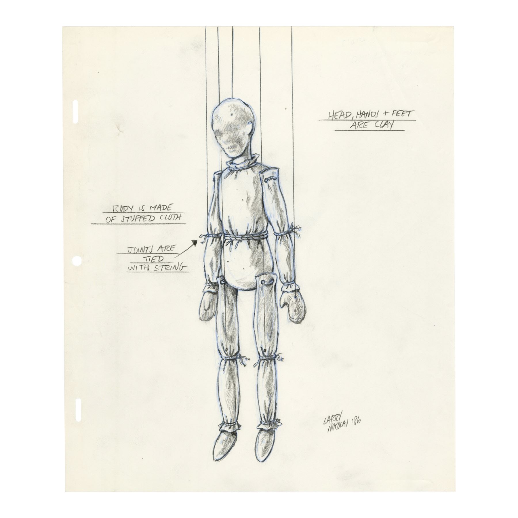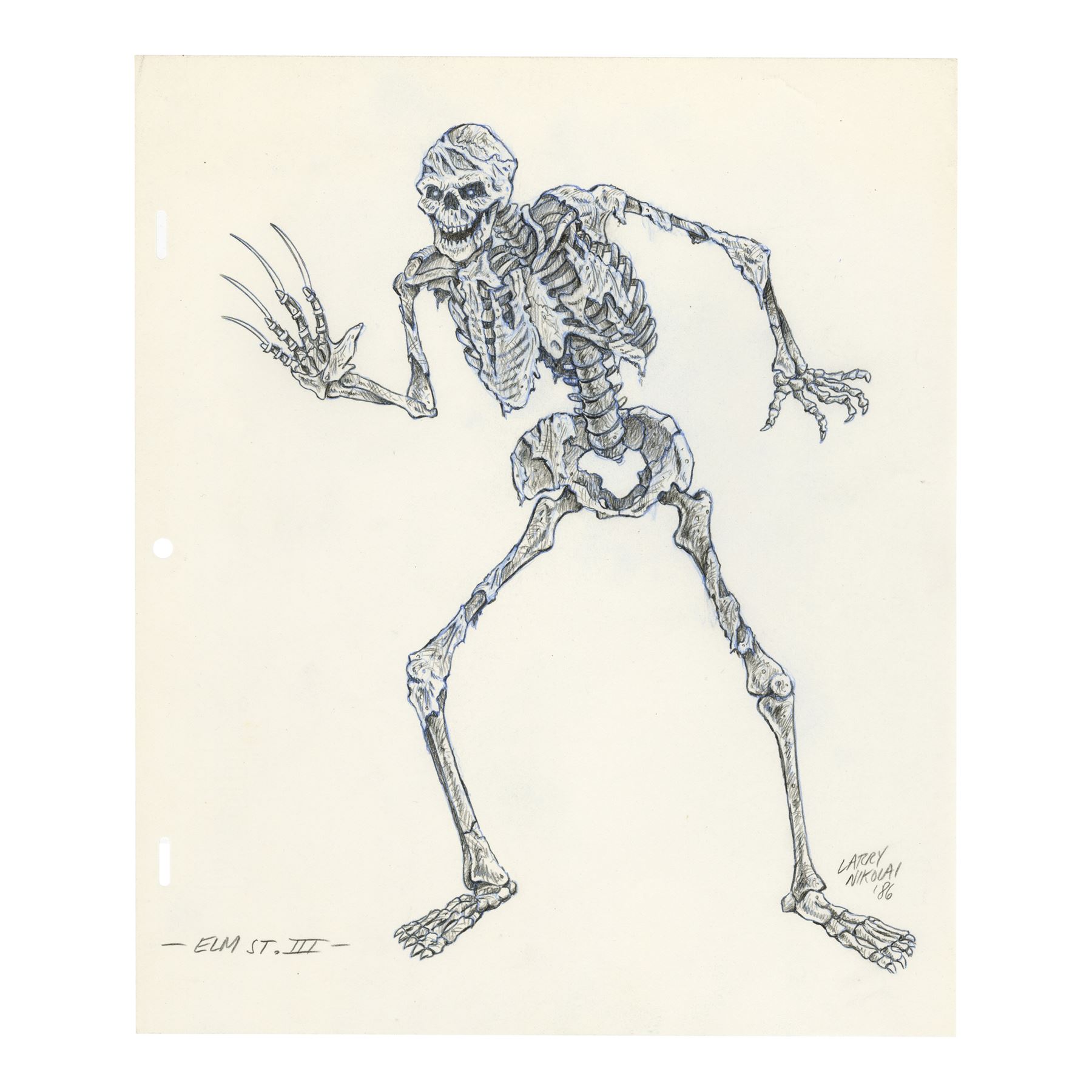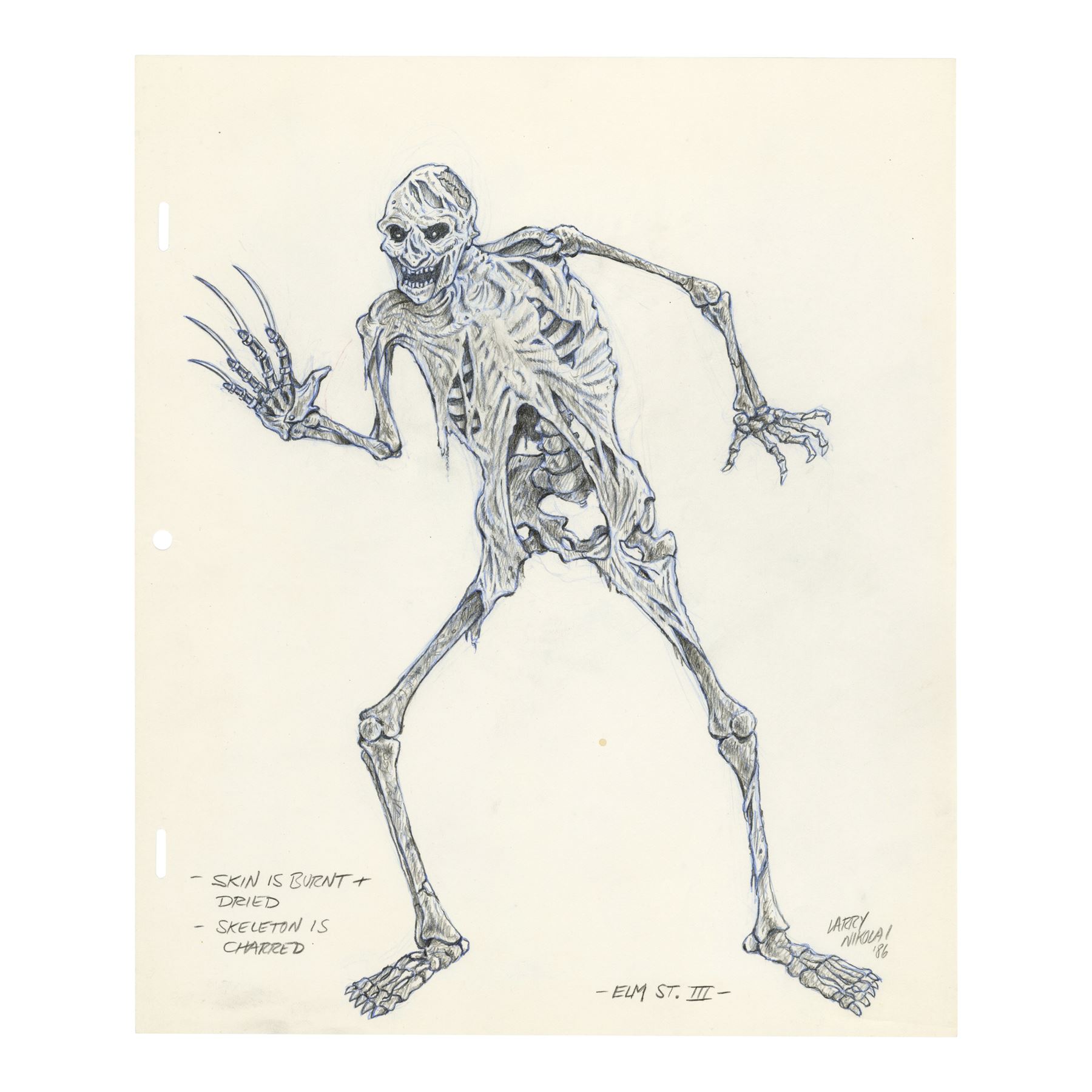 NIGHTMARE ON ELM STREET 3, A: DREAM WARRIORS (1987) - Set of Five Hand-Drawn Larry Nikolai Freddy Puppet and Skeleton Concept Sketches - Five puppet dream concept sketches hand-drawn by Larry Nikolai for the production of Chuck Russell's A Nightmare on Elm Street 3: Dream Warriors. Freddy Krueger (Robert Englund) transformed from a puppet only to puppet Phillip Anderson (Bradley Gregg) to his own death, and killed Lieutenant Donald Thompson (John Saxon) by transforming into a skeleton. Both sequences were created using stop-motion animation designed by Doug Beswick Productions, for whom Nikolai was a production illustrator.