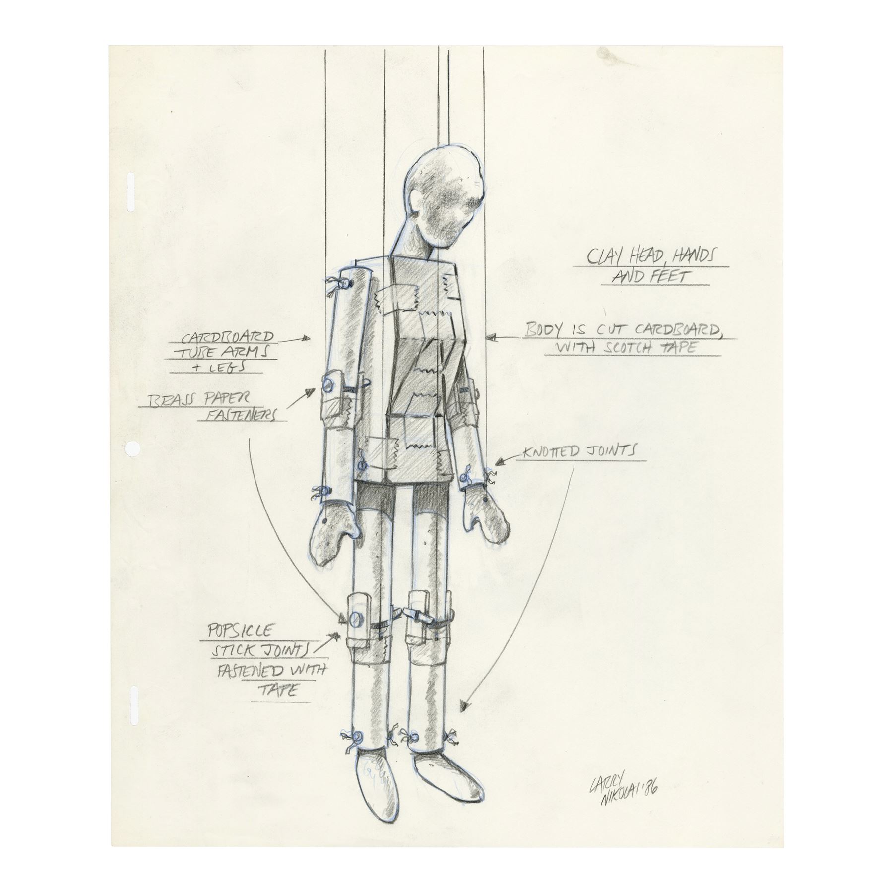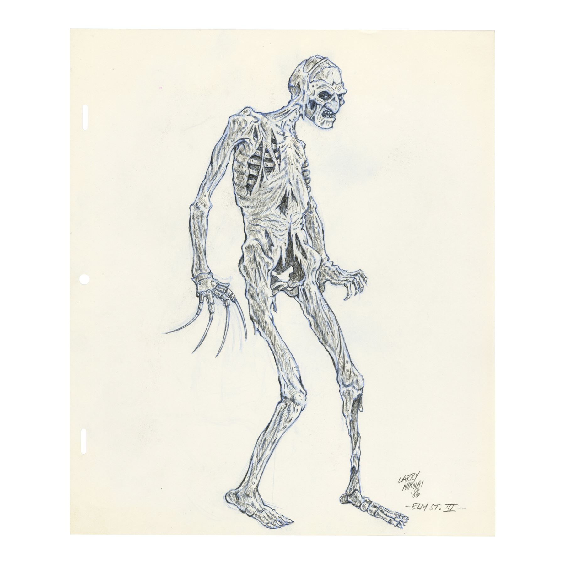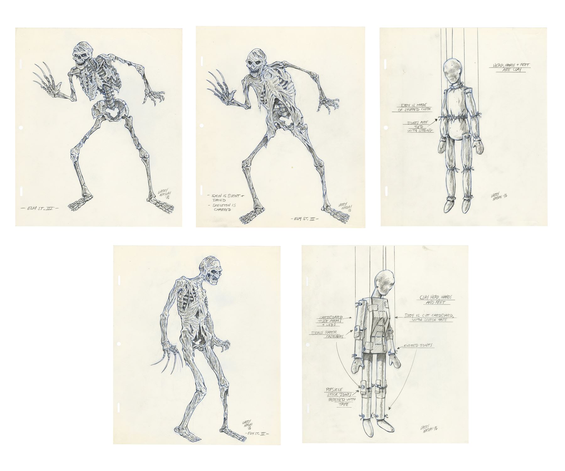 NIGHTMARE ON ELM STREET 3, A: DREAM WARRIORS (1987) - Set of Five Hand-Drawn Larry Nikolai Freddy Puppet and Skeleton Concept Sketches - Five puppet dream concept sketches hand-drawn by Larry Nikolai for the production of Chuck Russell's A Nightmare on Elm Street 3: Dream Warriors. Freddy Krueger (Robert Englund) transformed from a puppet only to puppet Phillip Anderson (Bradley Gregg) to his own death, and killed Lieutenant Donald Thompson (John Saxon) by transforming into a skeleton. Both sequences were created using stop-motion animation designed by Doug Beswick Productions, for whom Nikolai was a production illustrator.