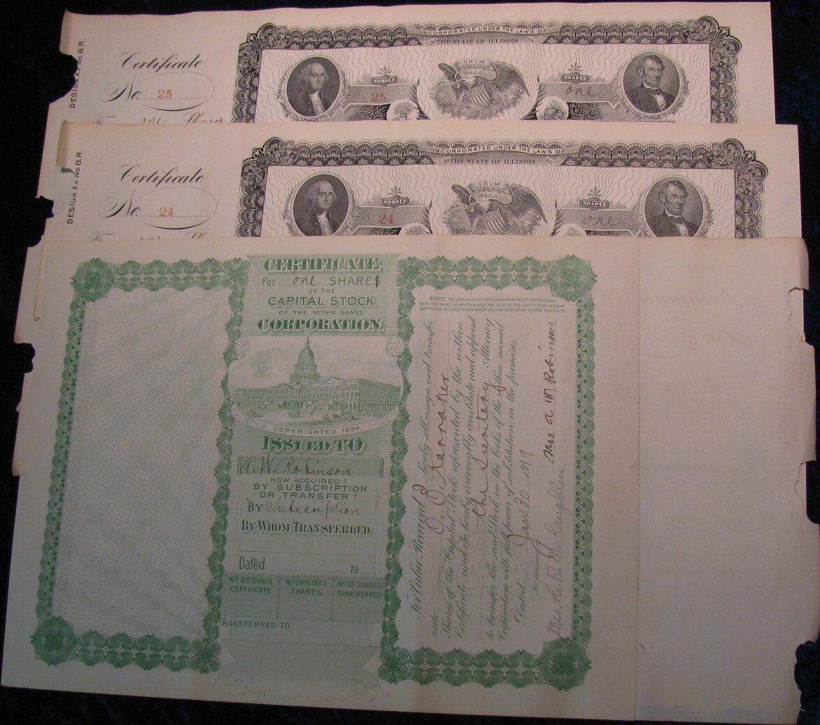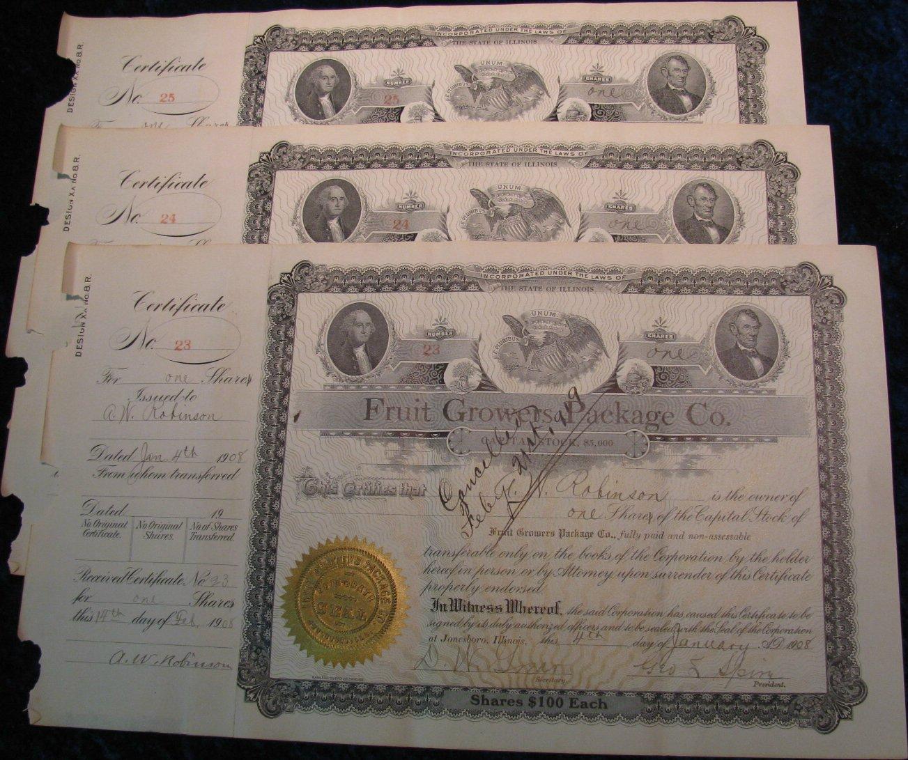 1217. (2) 1908 Fruit Growers Package Co. Stock Certificates.