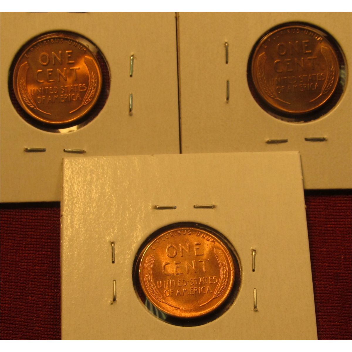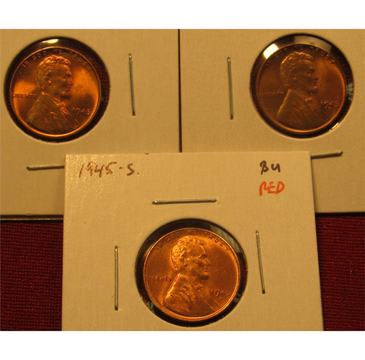 1217. 3 Lincoln Cents – 1945 PDS, all BU RED, part of set break