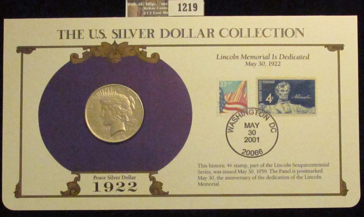 1922 Philadelphia Mint U.S. Peace Silver Dollar in a special protected cover with post marked commemorative cover and stamps.