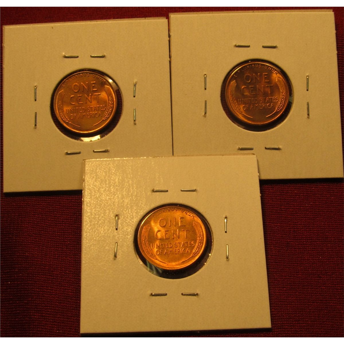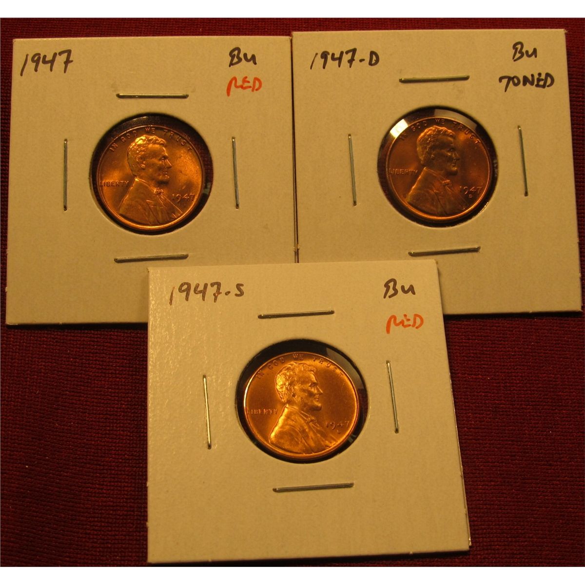 1219. 3 Lincoln Cents – 1947 BU RED, 1947-D BU toned & 1947-S BU RED, part of set break