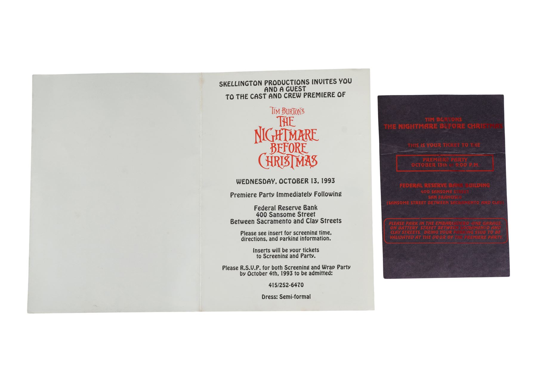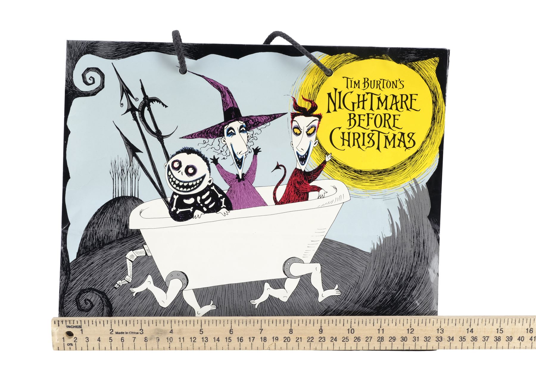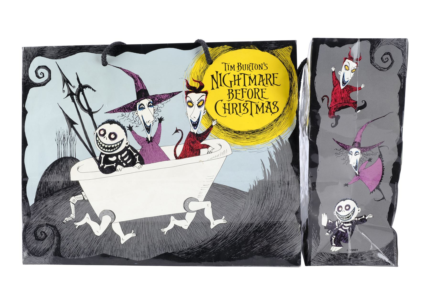 This lot consists of one VHS tape of the film in a black plastic case; one black and red print premiere party invitation; one black-and-white premiere screening invitation card featuring Jack Skellington's silhouette on the swirl hill; three acrylic kaleidoscopes with two in original packaging and two printed notes; two enamel pins; six metal and enamel pinback pins; two Jack Skellington keychains; two black gift bags featuring Lock, Shock, and Barrel; and three film themed wooden pencils with a spinning rubber Jack figurine. This lot exhibits bending on the invitations, and stains on the kaleidoscope notes. Dimensions: (each) 13" x 10" x 3" (33 cm x 25.5 cm x 7.75 cm)