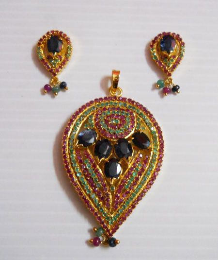 122.15 CTW GOLD PLATED SAPPHIRE/EMERALD/ RUBY PENDANT A **|**|** 122.15 CTW GOLD PLATED SAPPHIRE/EMERALD/ RUBY PENDANT AND EARRING SET STERLING SILVER ; MSRP: $1225