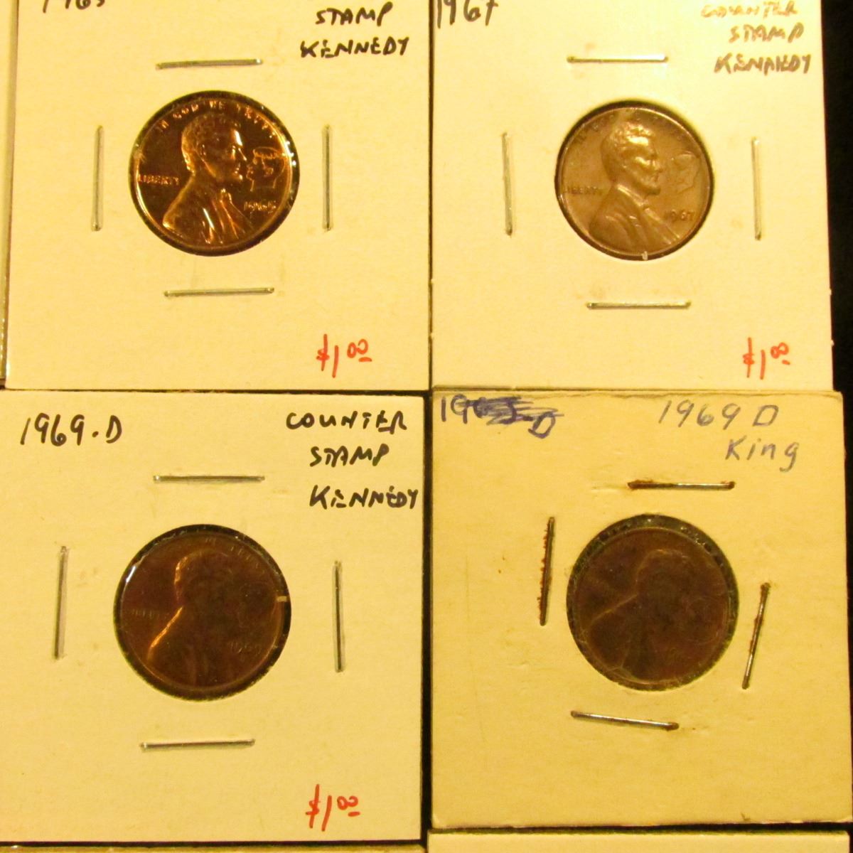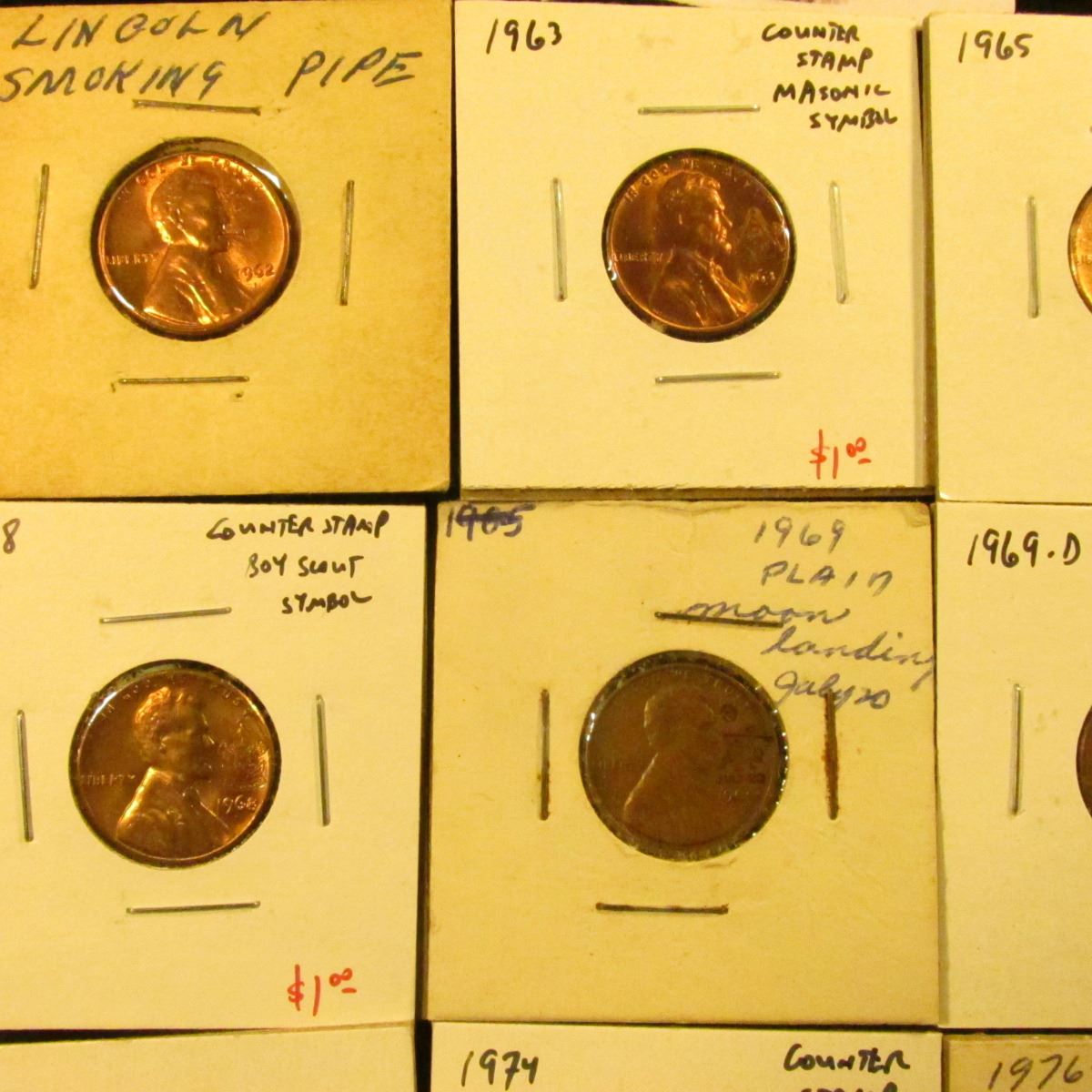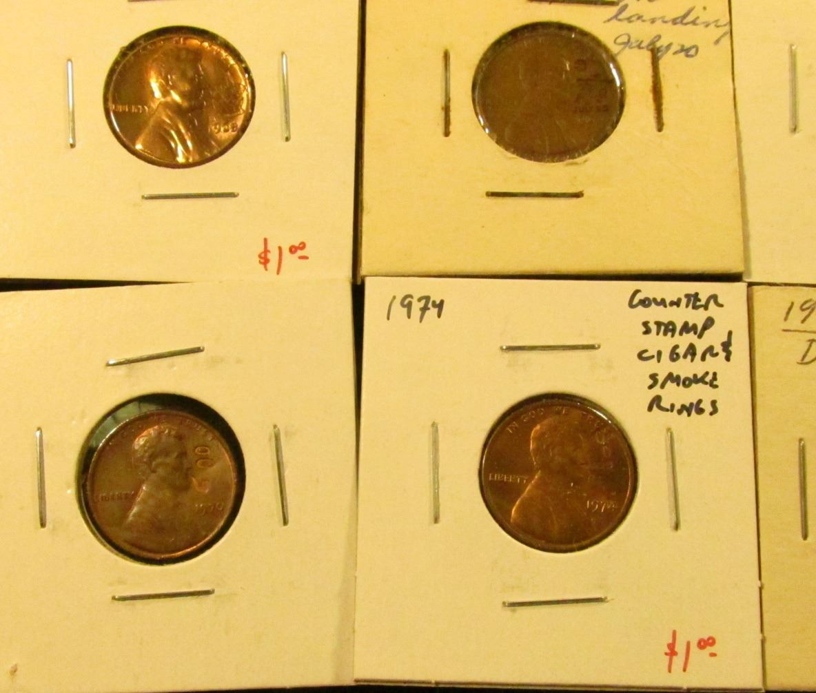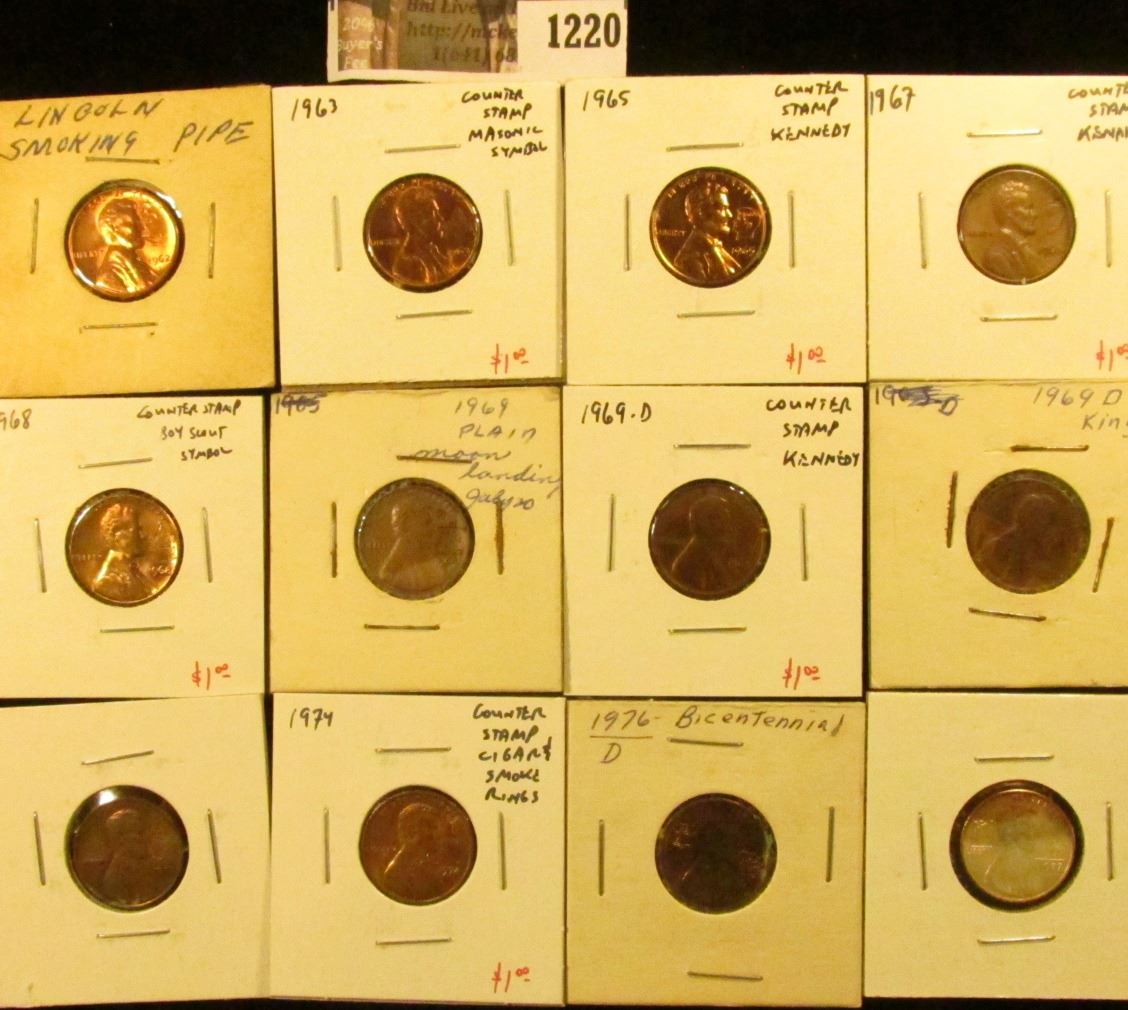 Group of 12 Counter-stamped Lincoln Memorial Cents, dates range from 1962 to 1977, subject matter includes Masonic, Boy Scouts, Moon Landing, Kennedy, Pipe Smoking, MLK, Bicentennial, etc, group value $10+