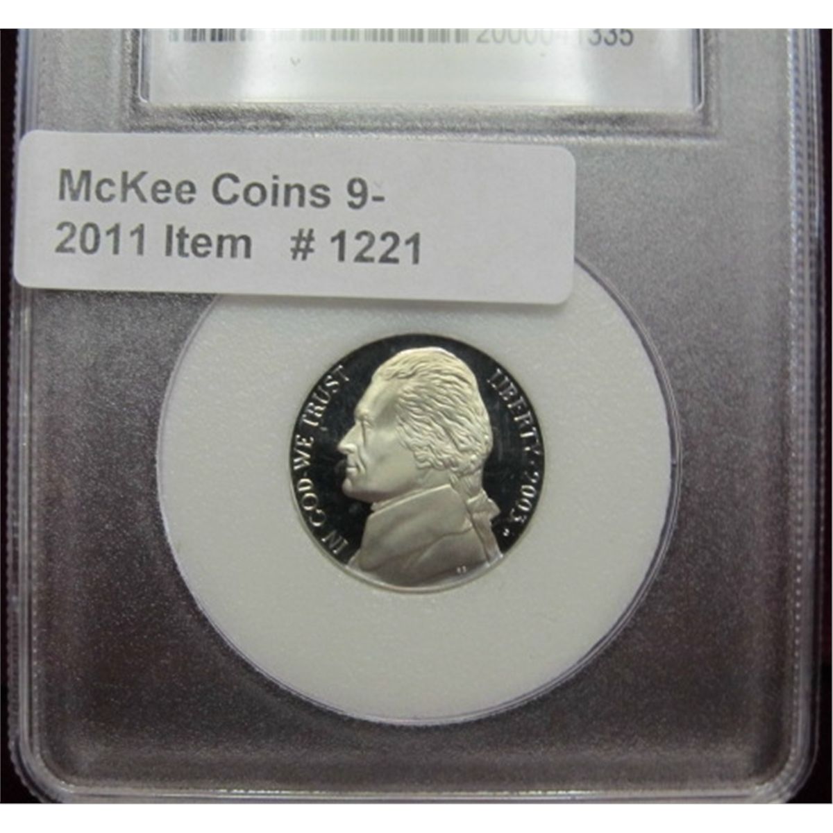 1221. 2003 S Jefferson Nickel PCC slabbed PR70 DCAM.