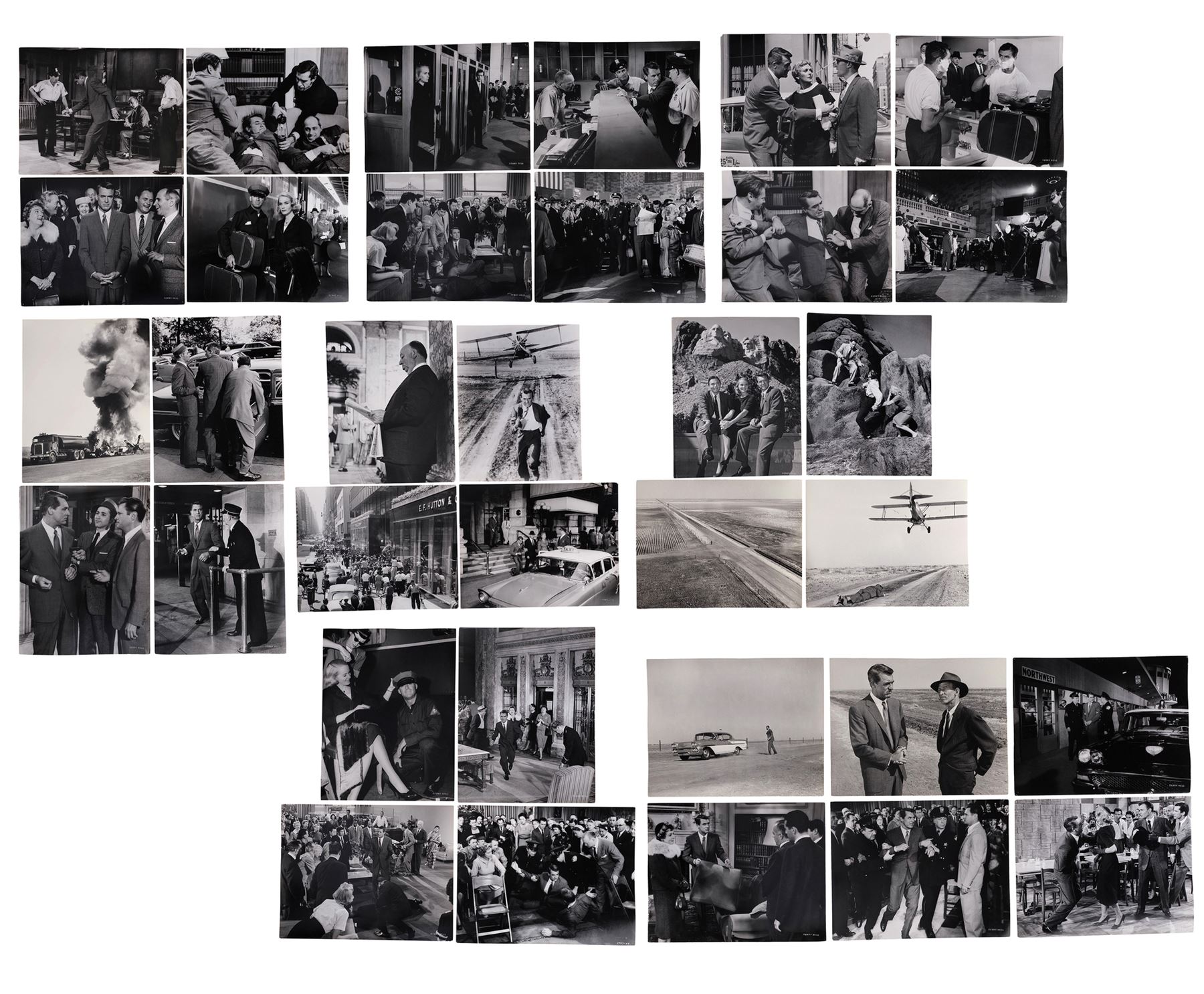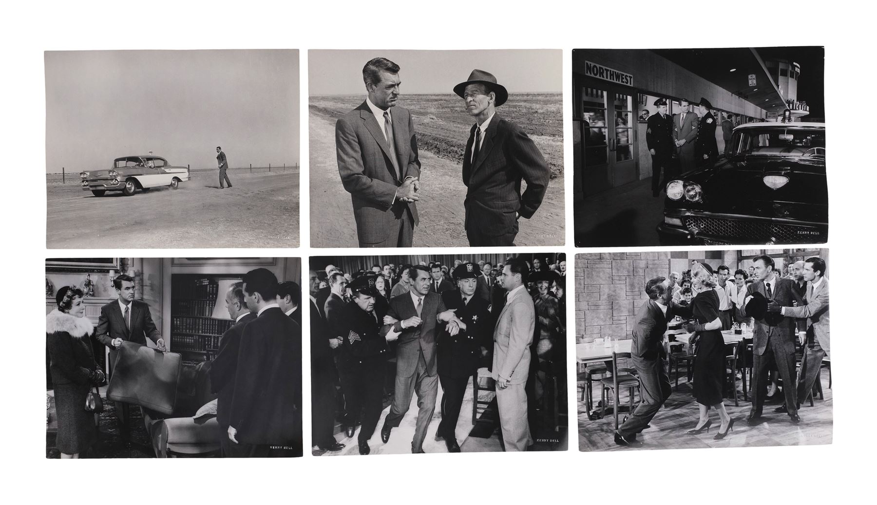 NORTH BY NORTHWEST (1959) - Set of 34 Production Photographs by Photographer Kenny Bell - Set of 34 photographs from the production of Alfred Hitchcock's North by Northwest by photographer Kenny Bell. In the film, advertising executive Roger Thornhill (Cary Grant) was kidnapped and mistaken for government agent George Kaplan by foreign spy Phillip Vandamm (James Mason). Thornhill was later framed for the murder of Lester Townsend (Philip Ober) and fled the scene before meeting Eve Kendall (Eva Marie Saint).