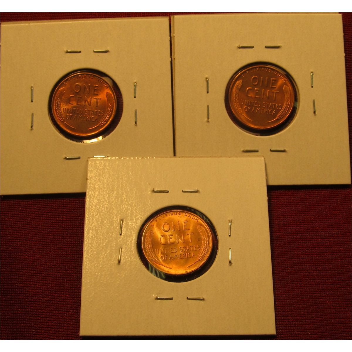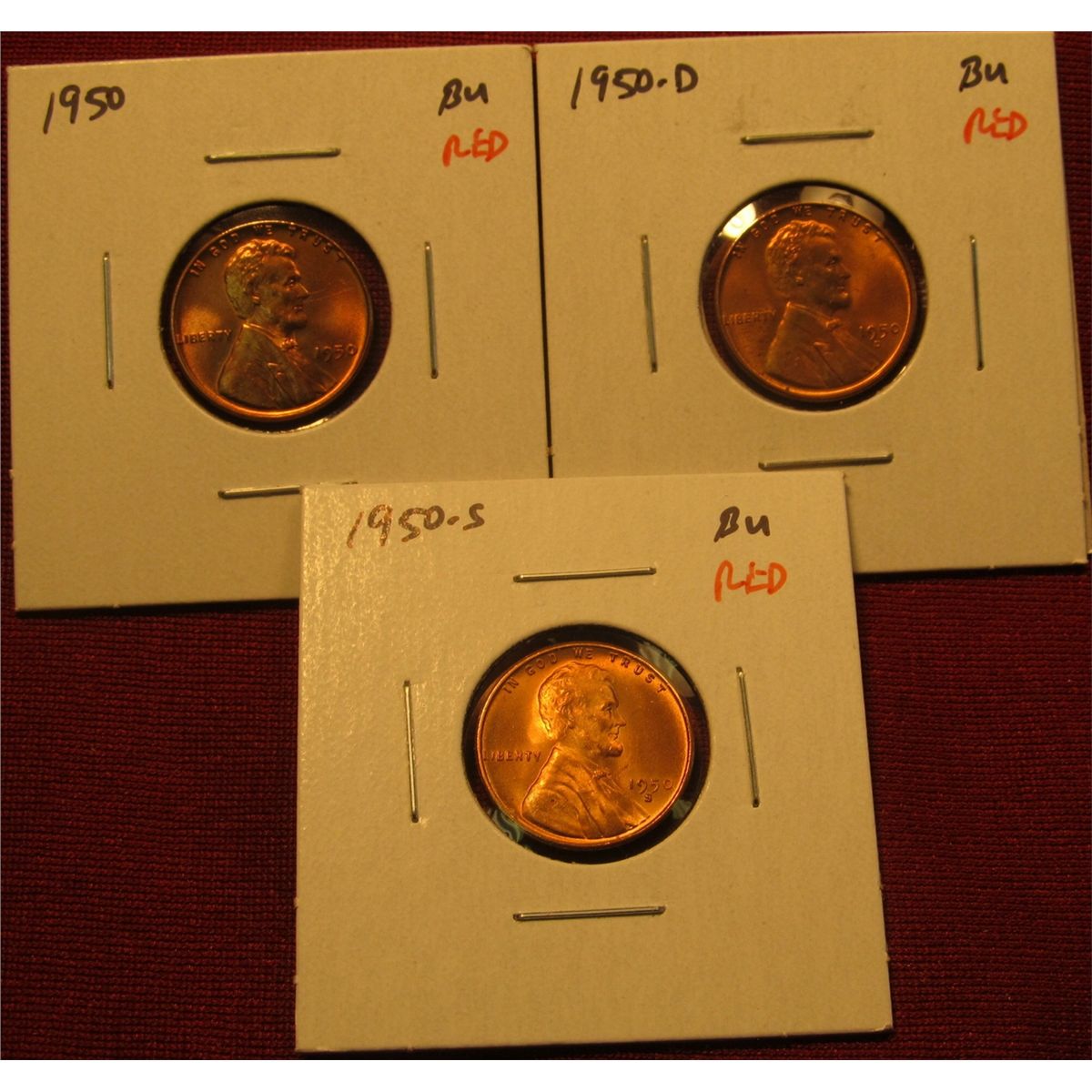 1222. 3 Lincoln Cents – 1950 PDS, all BU RED, part of set break