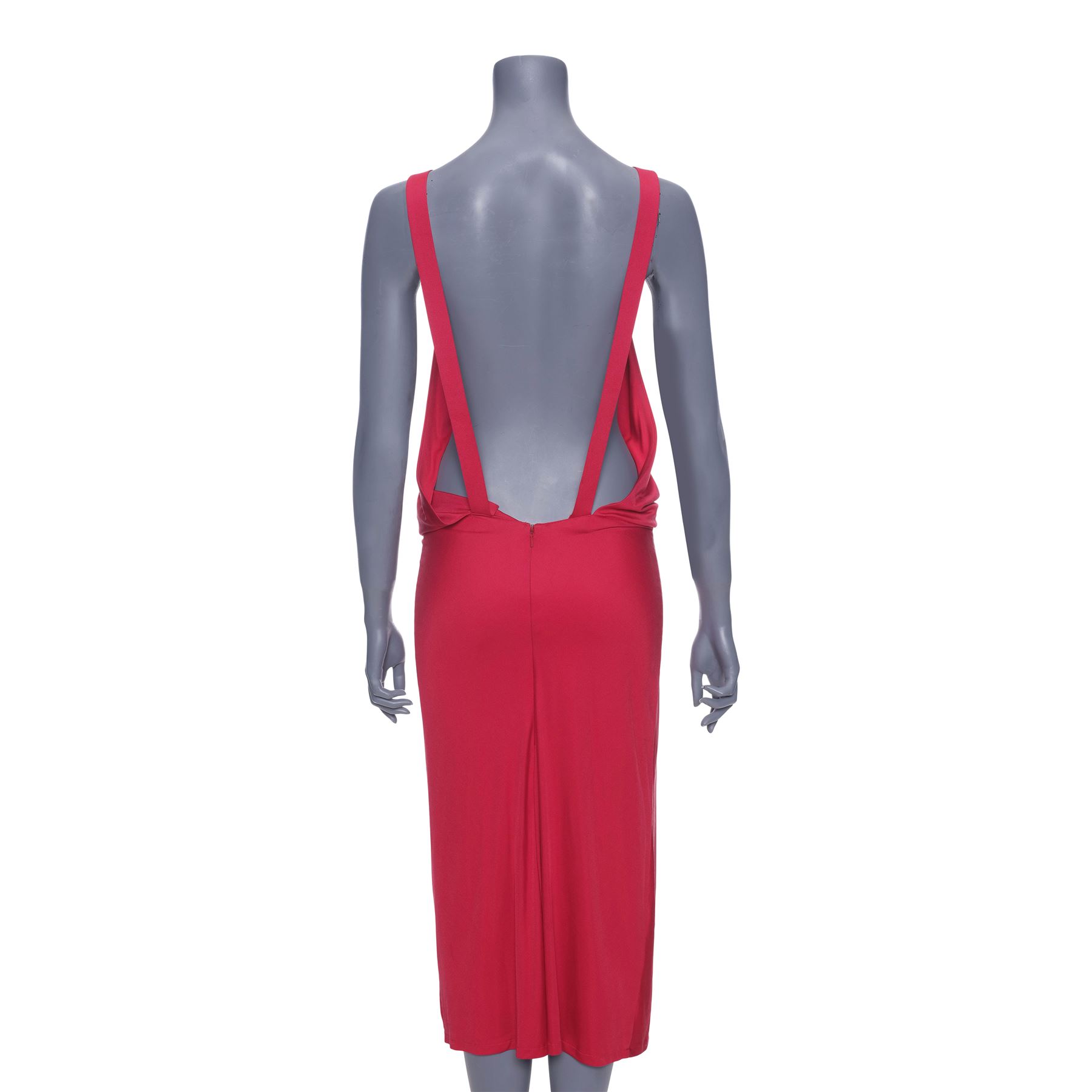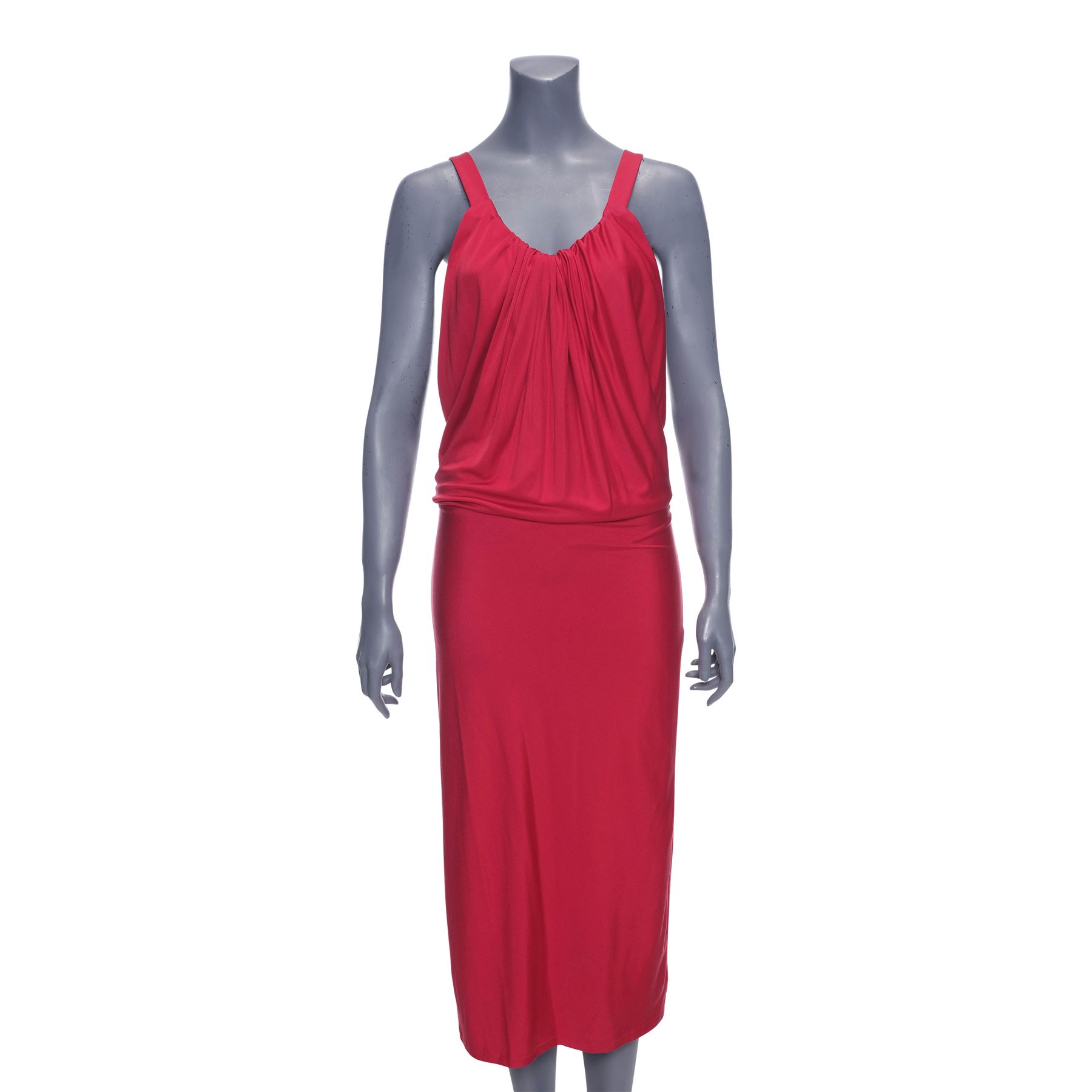 This lot consists of a red silken-blend sleeveless dress with a matching sewn-in slip and a zippered back, and a paper wardrobe tag handmarked "'Lisa' EMP CH. 9 1 of 3" in red ink. It exhibits small pinholes in a few places.