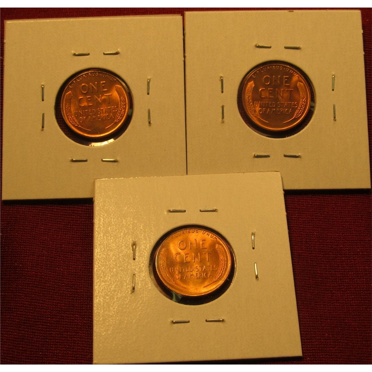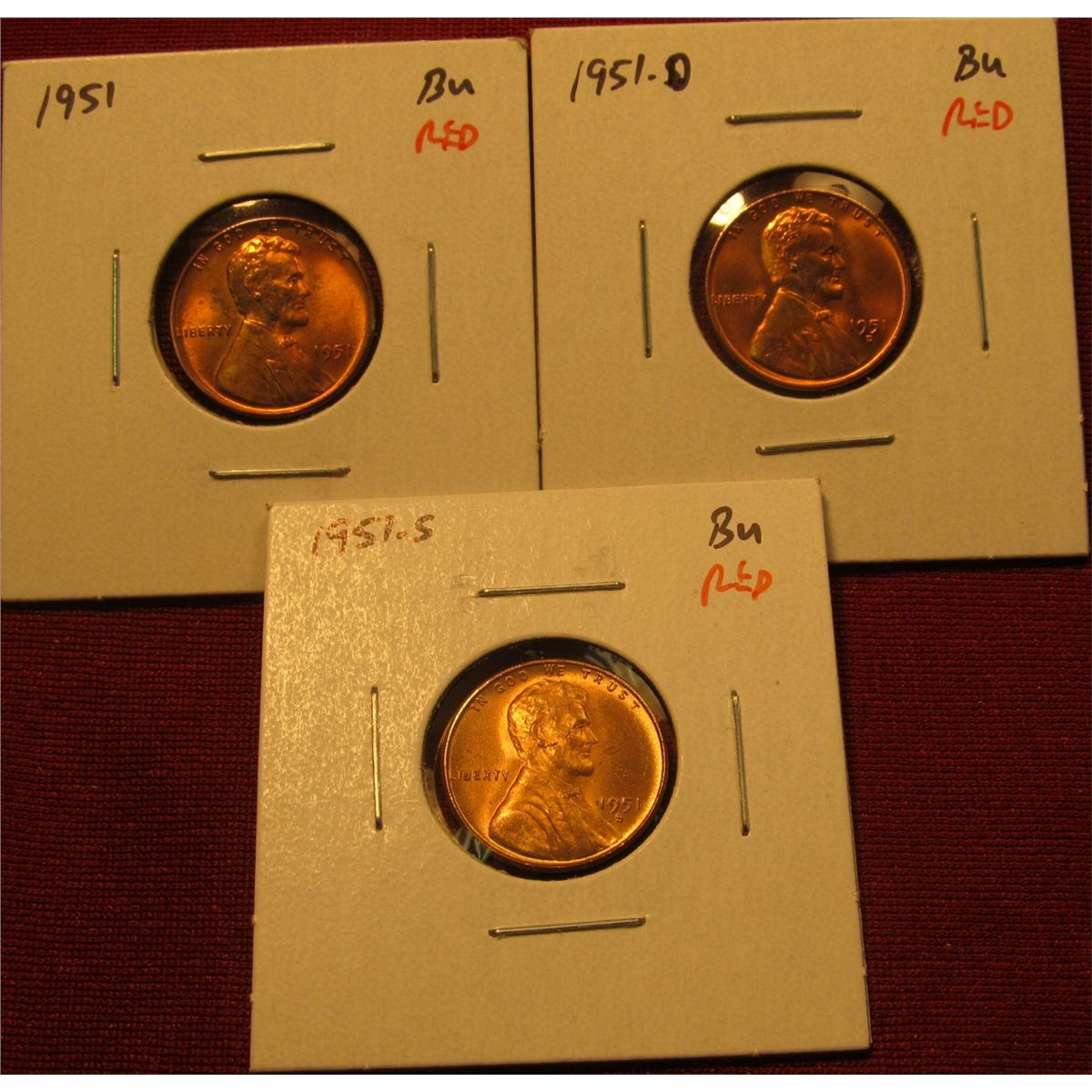 1223. 3 Lincoln Cents – 1951 PDS, all BU RED, part of set break