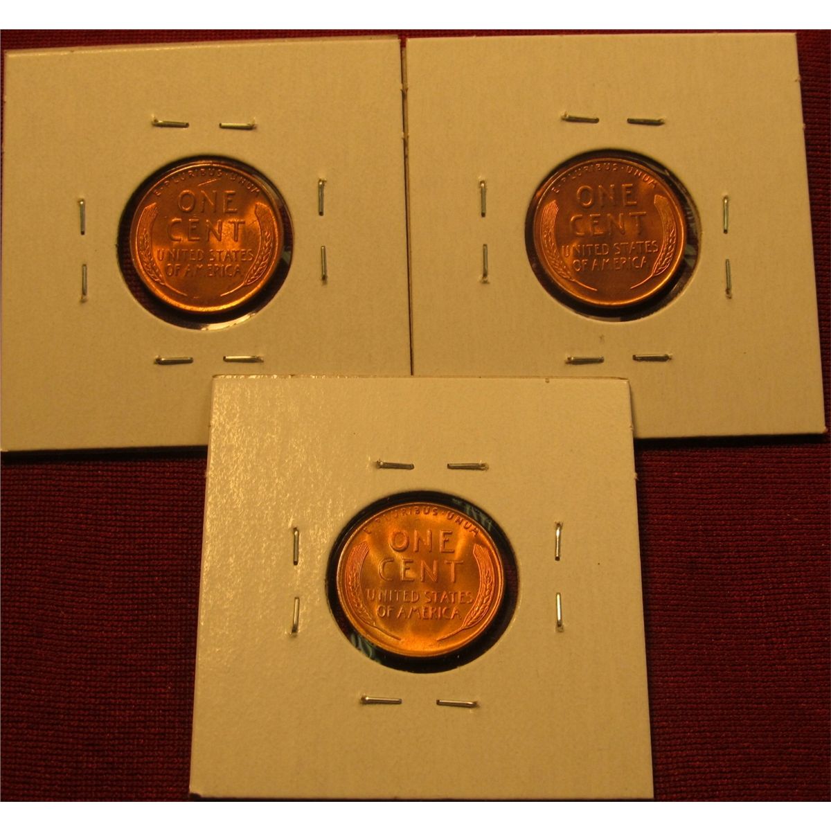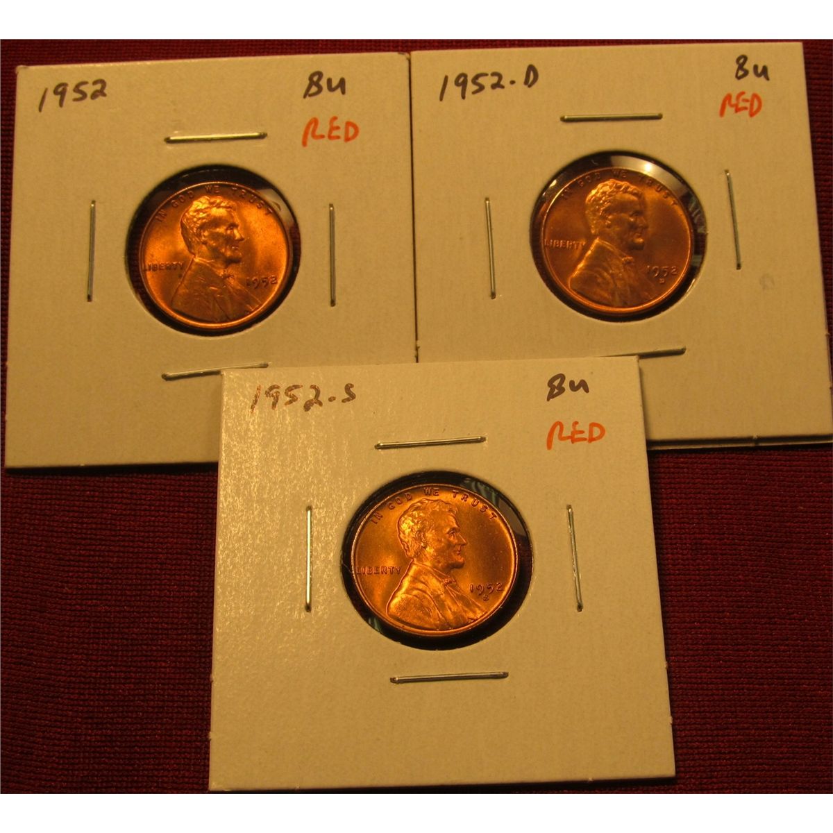 1224. 3 Lincoln Cents – 1952 PDS, all BU RED, part of set break