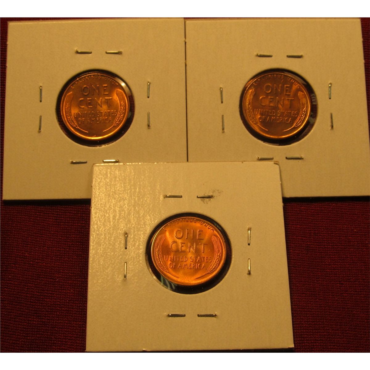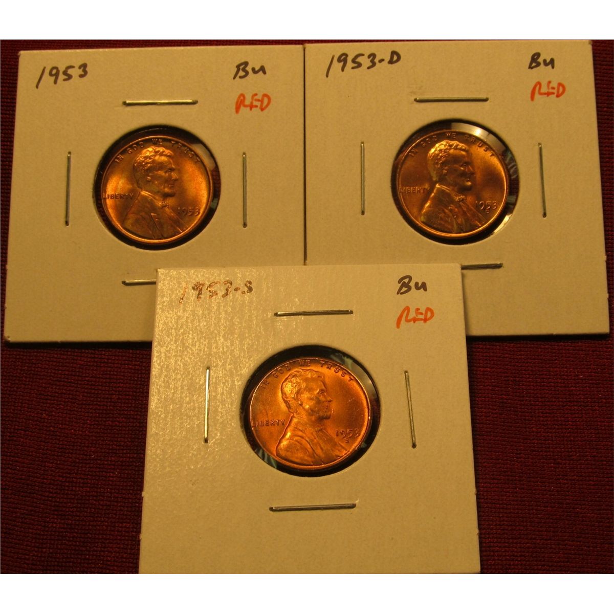 1225. 3 Lincoln Cents – 1953 PDS, all BU RED, part of set break