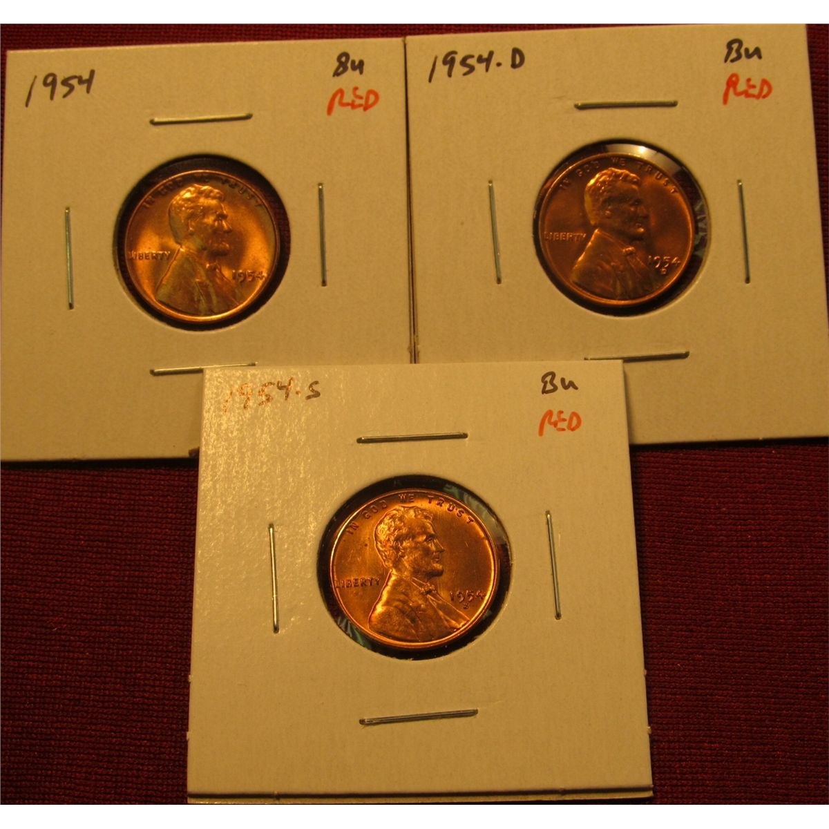 1226. 3 Lincoln Cents – 1954 PDS, all BU RED, part of set break