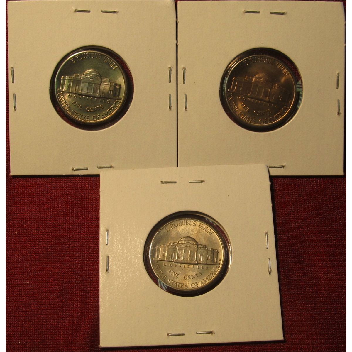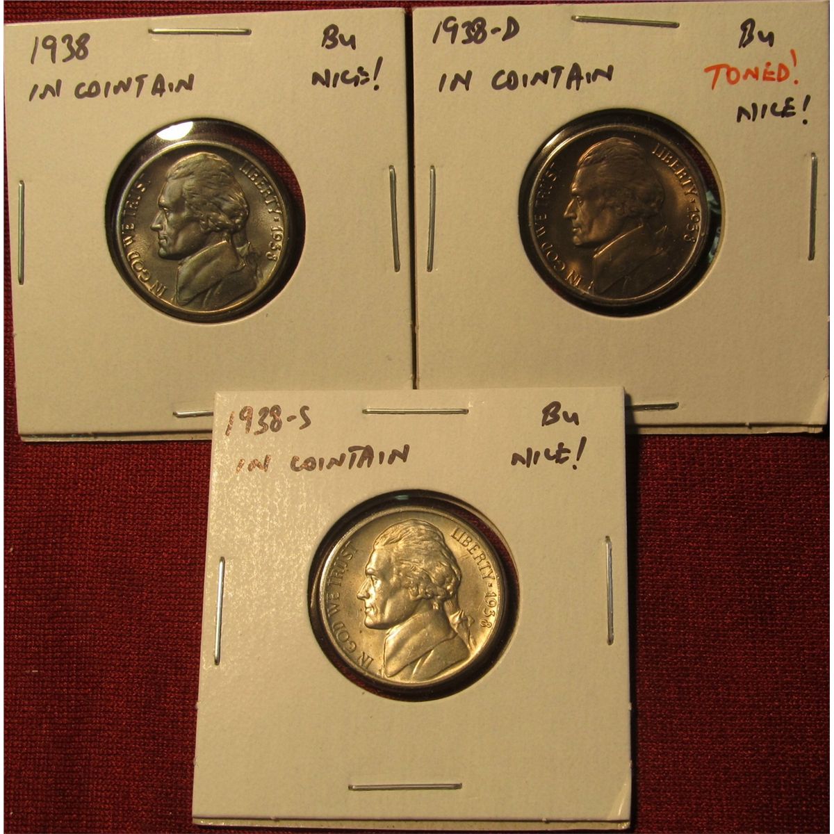 1229. 3 Jefferson Nickels - 1938 P BU , 1938-D BU toned & 1938-S BU , part of set break, all in Cointains