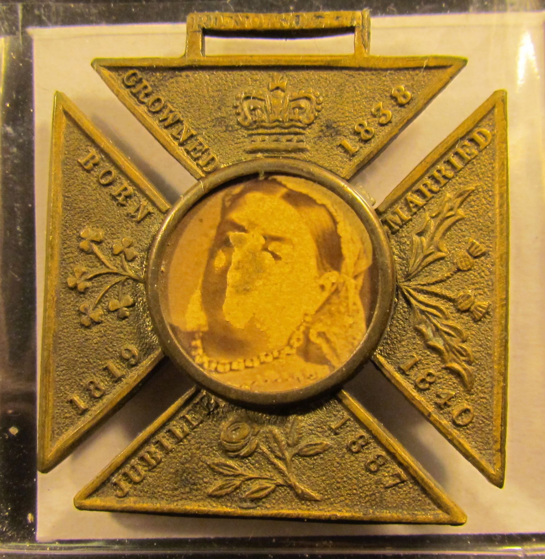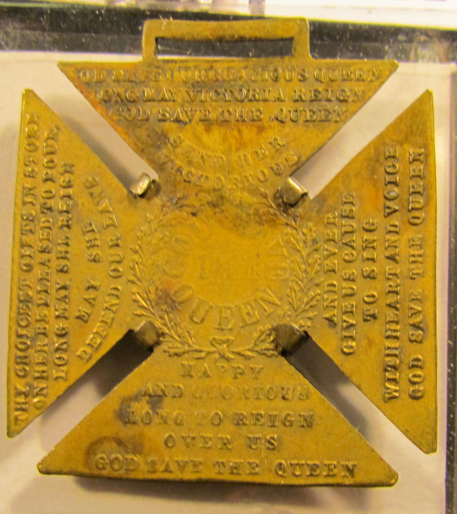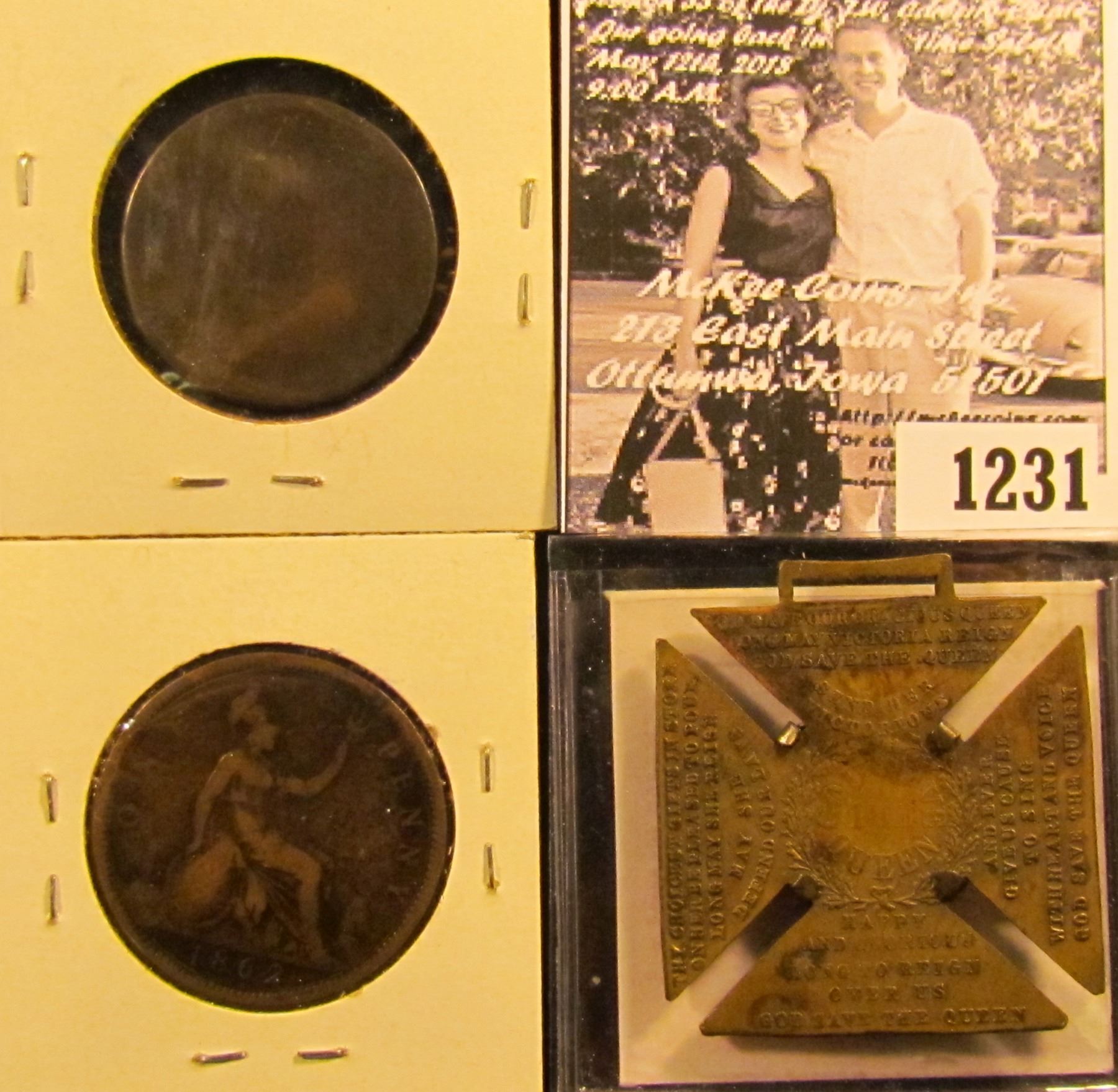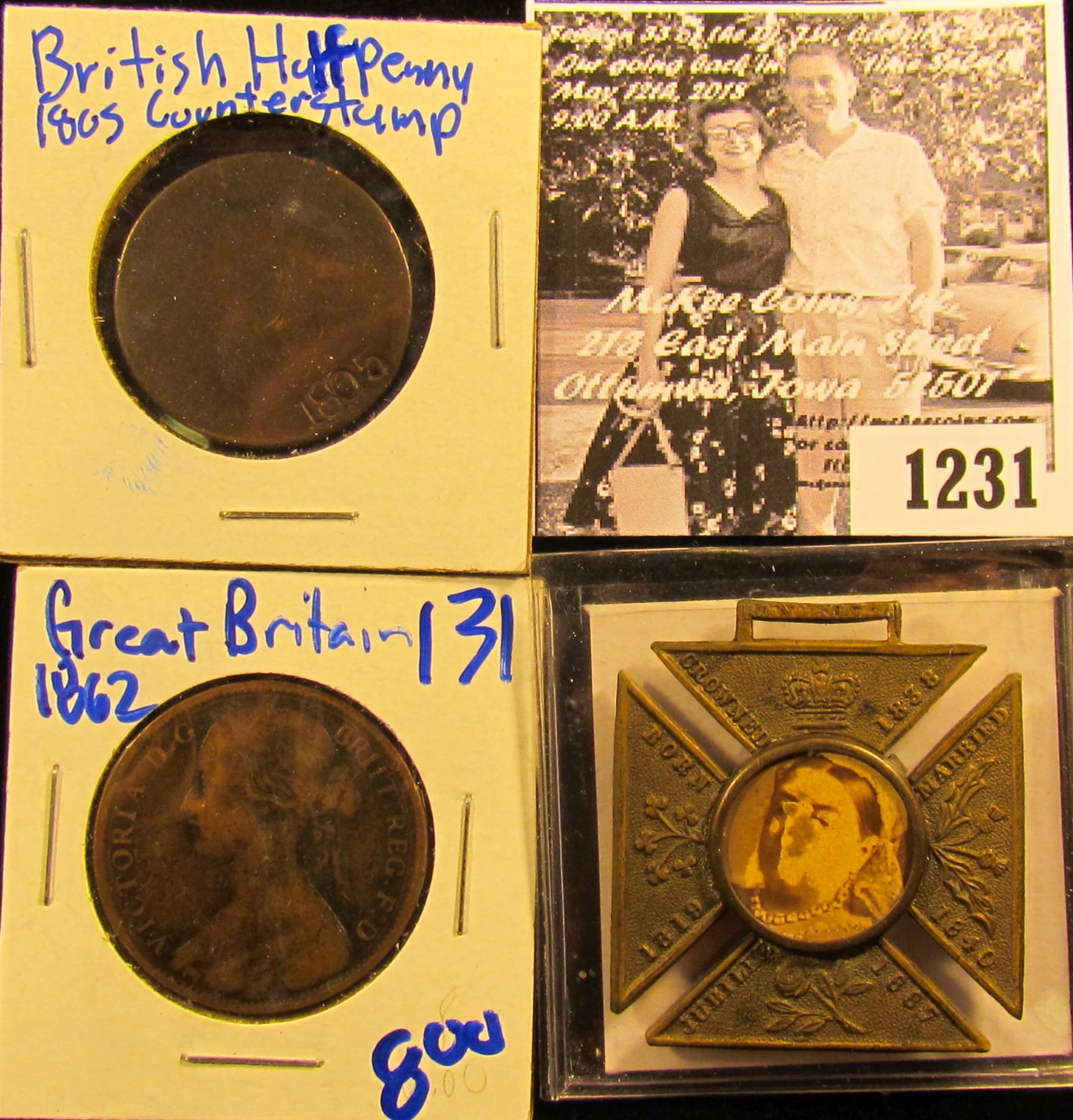 1231 . 1862 British Large Cent; 1805 British Half Penny With 1805 Counter stamp; British Medal With The Face Of Queen Victoria Celebrating 50th Anniversary Of Her Coronation, Reverse of the Medal has the words to the song “God Save The Queen”