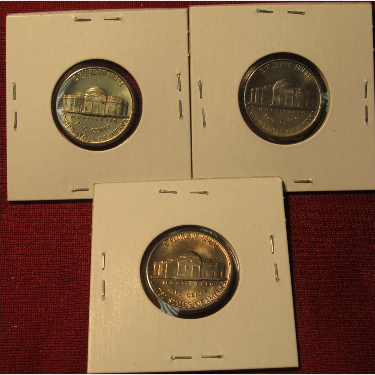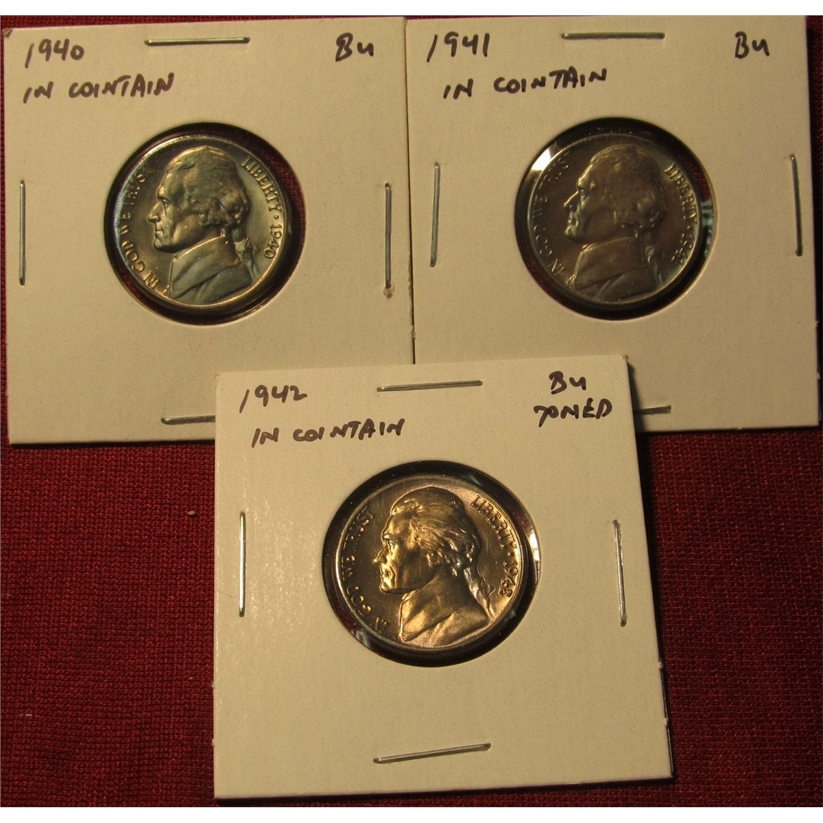 1231. 3 Jefferson Nickels - 1940 P BU , 1941 BU & 1942 BU toned, part of set break, all in Cointains