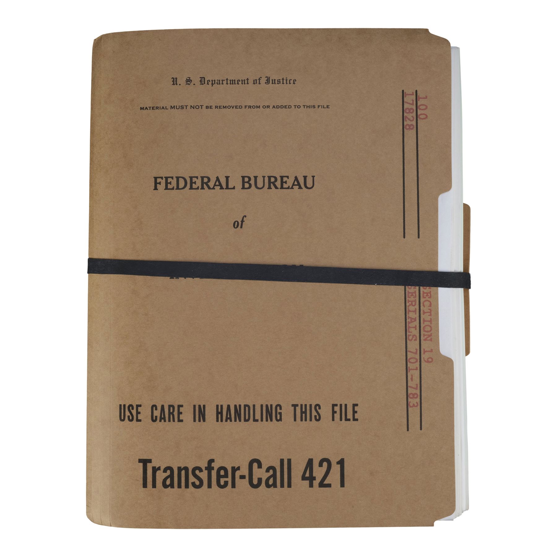This lot consists of one production-made brown manila folder printed with "U.S. Department of Justice," "Federal Bureau of Investigation," "Use Care in Handling This File," and "Transfer-Call 421" across the front, as well as "100," "Section 19," "17828," and "Materials 701-783" along the side in red ink. The folder is filled with various sheets of printed paper and bound with a brown strap. This lot exhibits creasing on the edges of the folder and creased corners on the papers. Dimensions: 9.25" x 11.5" x 1.25" (23.25 cm x 29.25 cm x 3.25 cm)