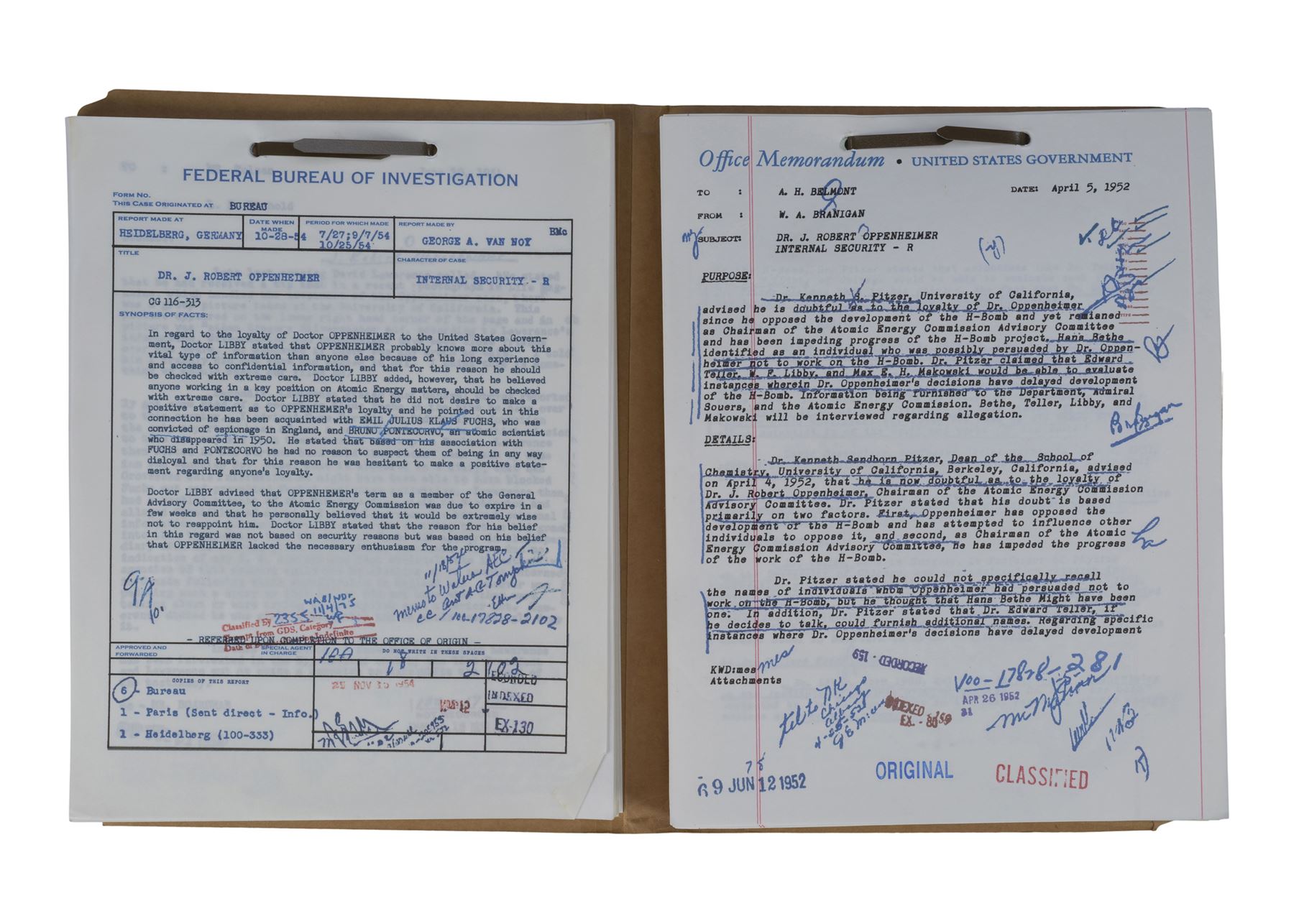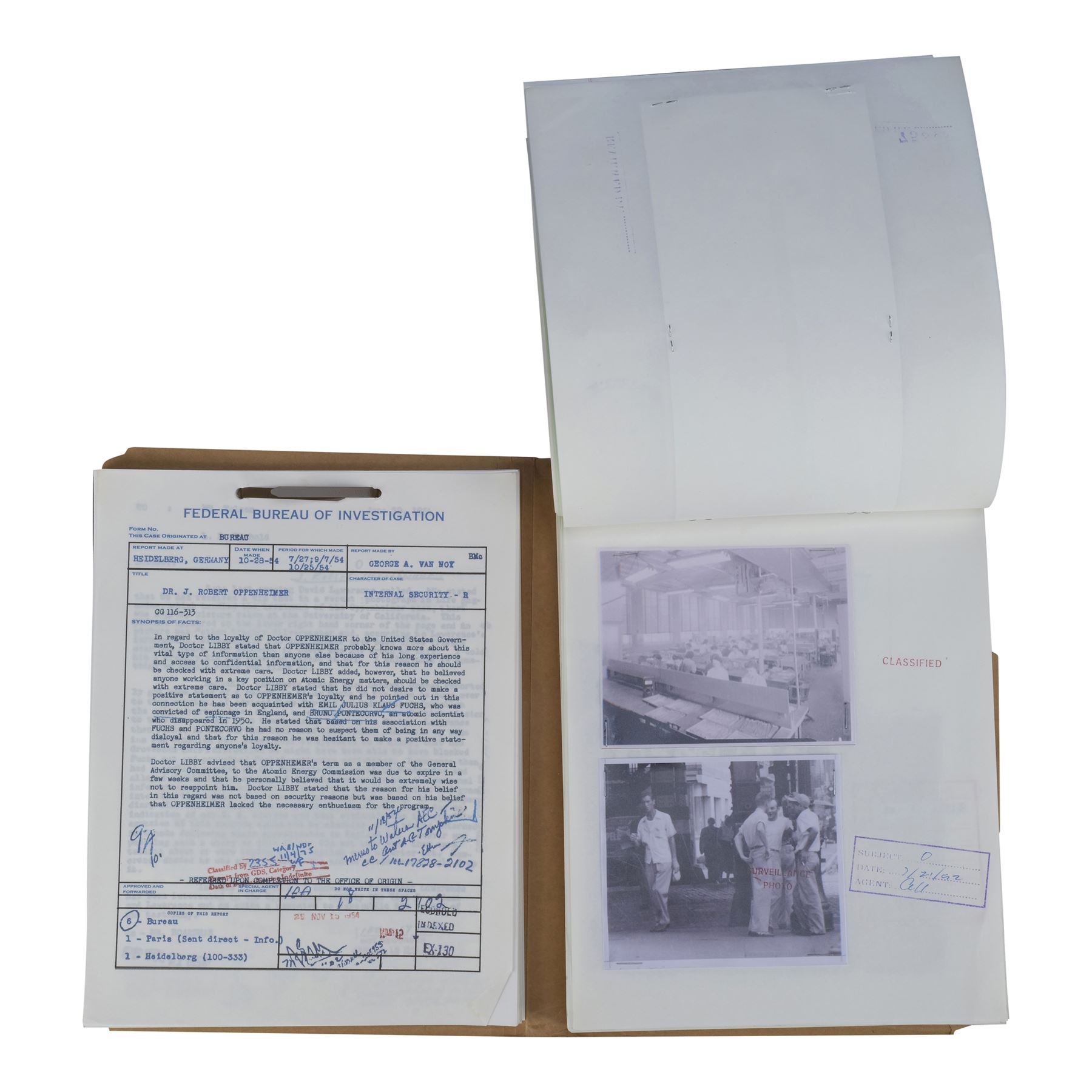OPPENHEIMER (2023) - Production-Made J. Robert Oppenheimer's (Cillian Murphy) FBI File - A production-made J. Robert Oppenheimer's (Cillian Murphy) FBI file from Christopher Nolan's Oppenheimer. William Borden (David Dastmalchian) acquired Oppenheimer's FBI file and used it to help orchestrate a security hearing to deny renewing Oppenheimer's Q clearance.
