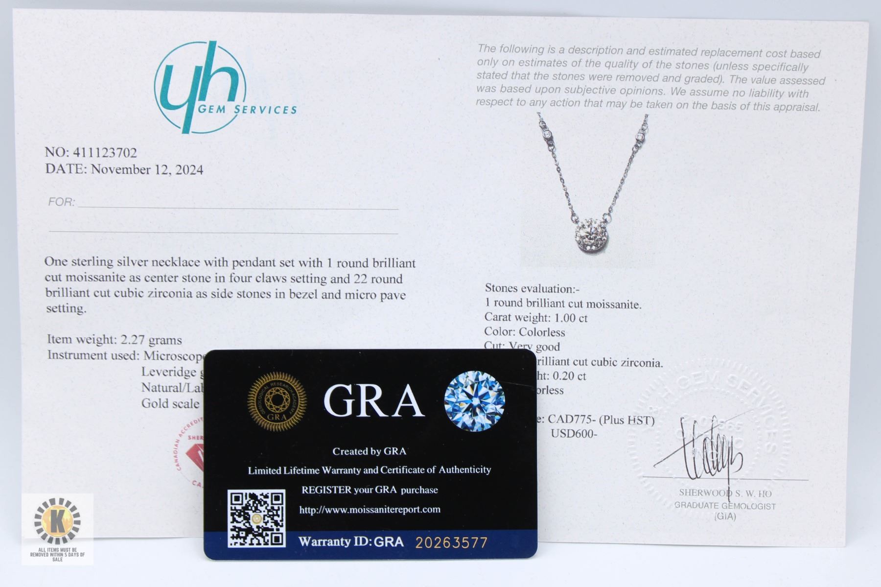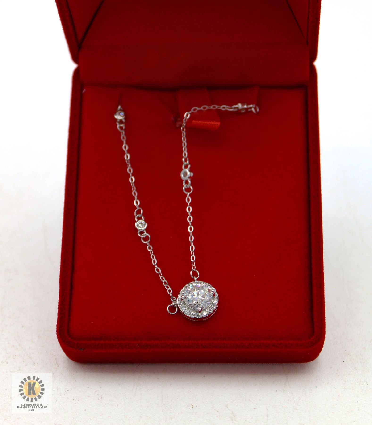 BRILLIANT CUT MOISSANITE STONE VVS D COLOR WITH 22 ROUND BRILLIANT CUT CUBIC ZIRCONIA SET IN ROUND HALO WITH MORE SET IN NECKLACE SET IN 925 SILVER PENDANT RETAIL VALUE $775.00