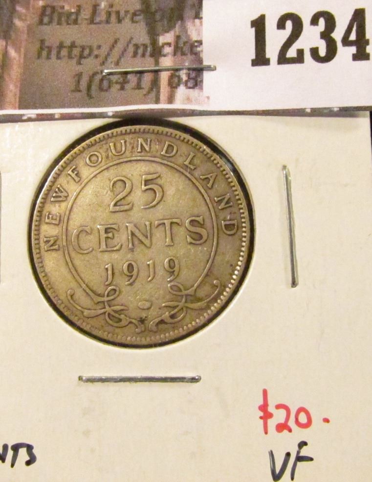 1234 . 1919C Newfoundland 25 Cents, VF, value $20