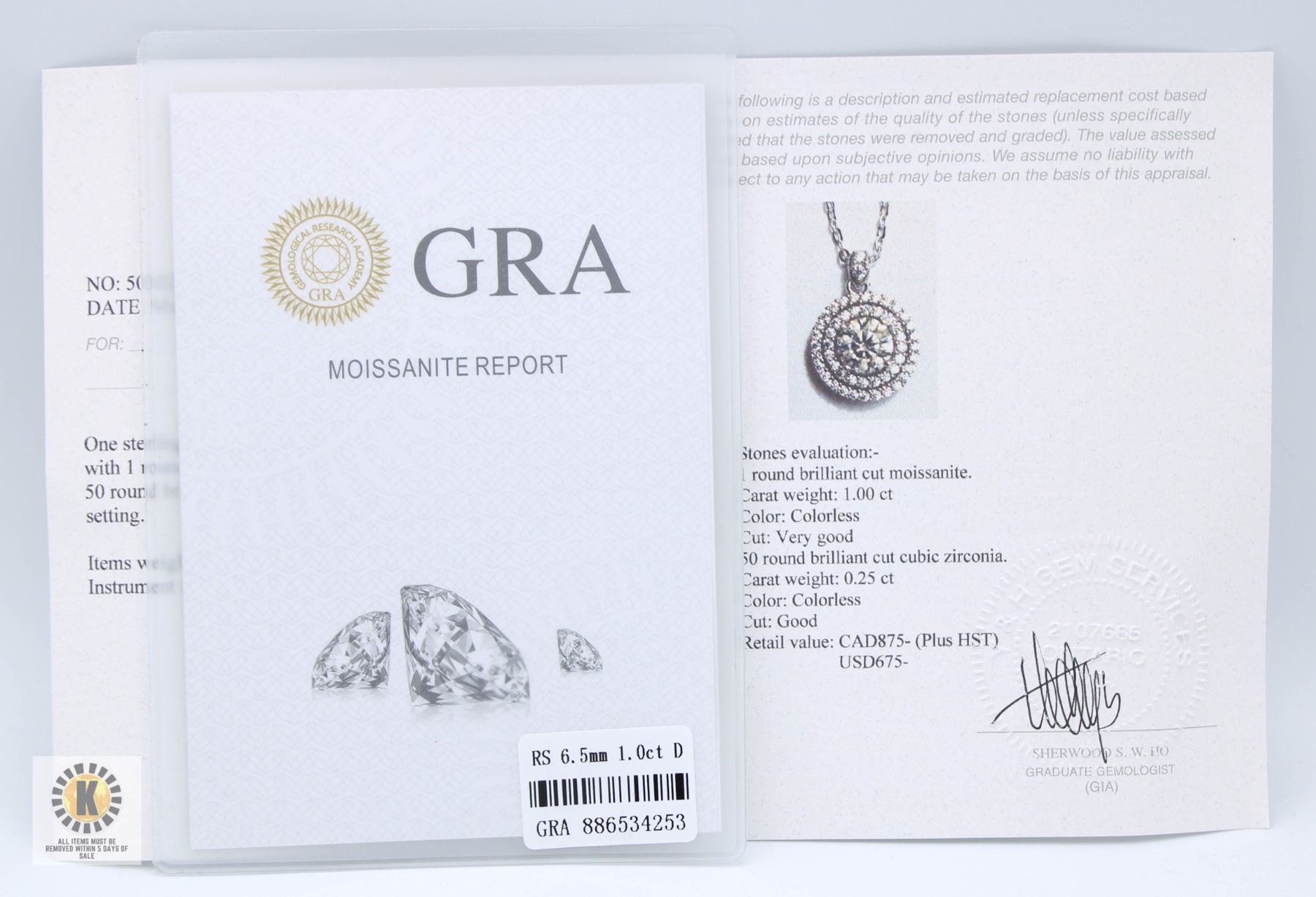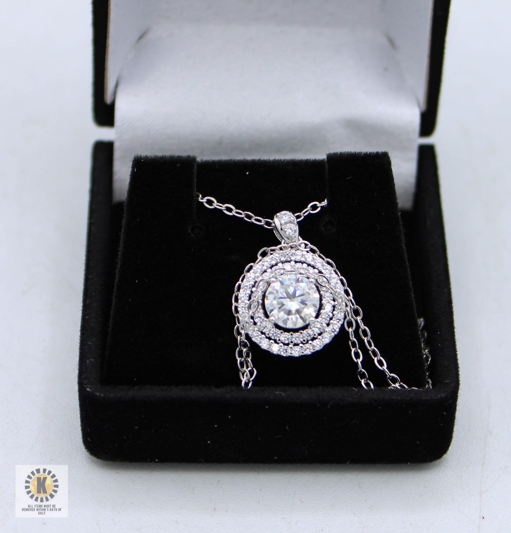 BRILLIANT CUT MOISSANITE STONE VVS COLORLESS WITH 50 ROUND BRILLIANT CUT CUBIC ZIRCONIA SET DUAL HALOS AROUND CENTER WITH SOME IN BALE SET IN 925 SILVER PENDANT RETAIL VALUE $875.00