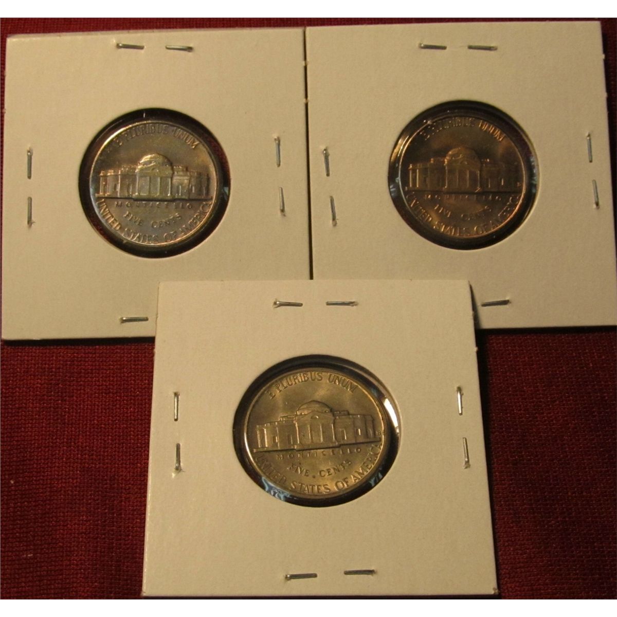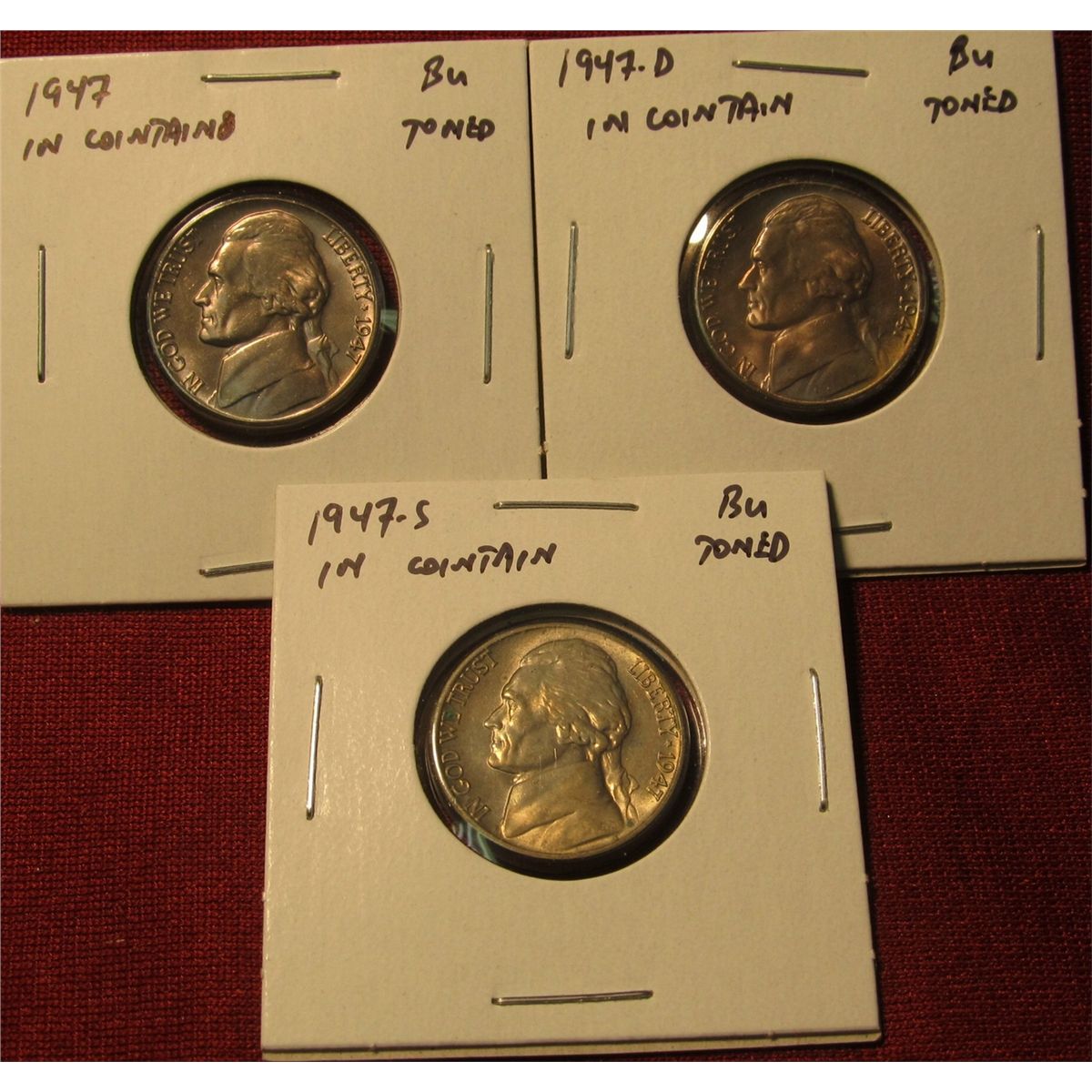 1237. 3 Jefferson Nickels – 1947 PDS, all BU toned, part of set break, all in Cointains